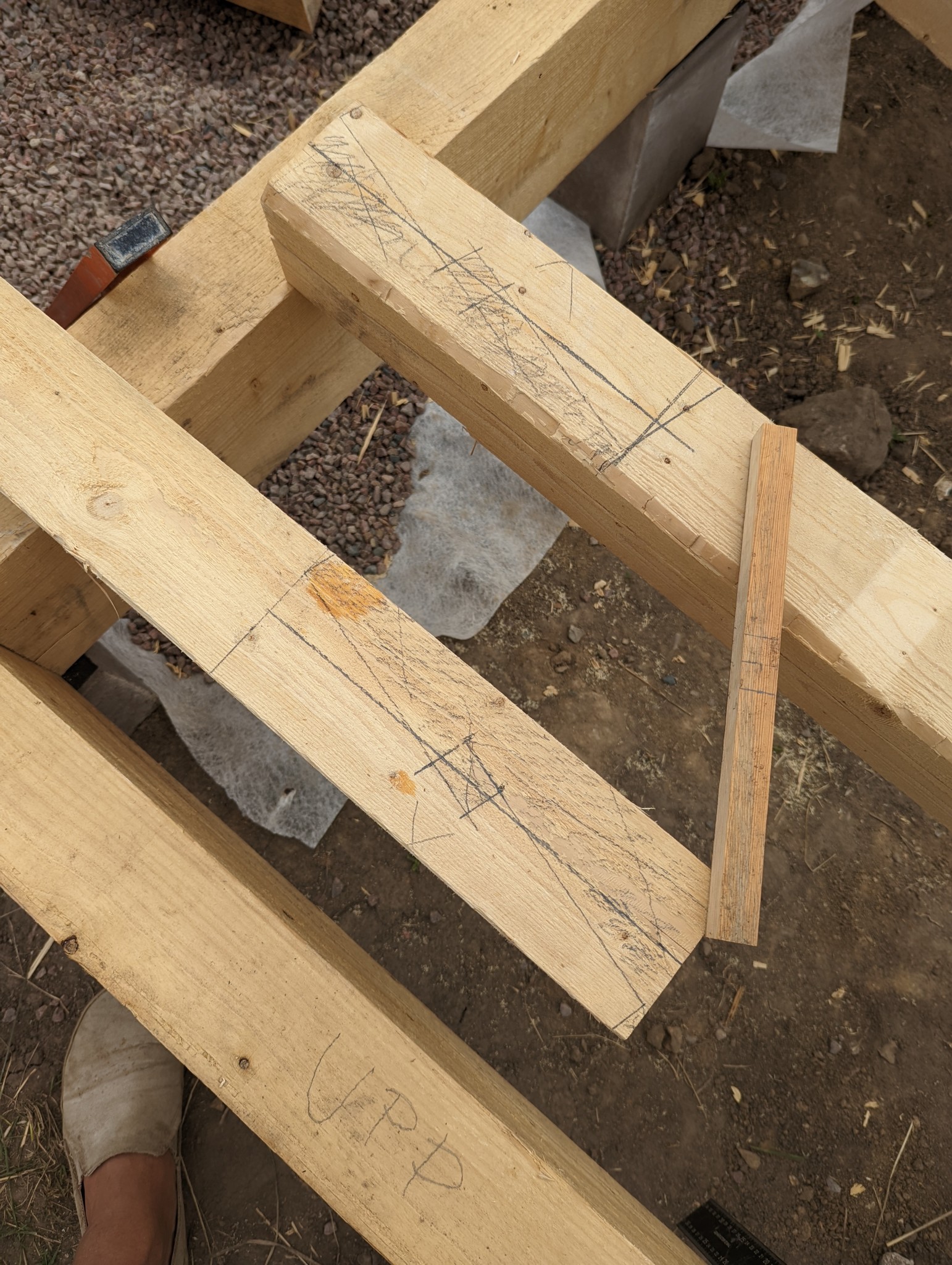 Fixerade snedsträvorna vid ramverket för att rita ut hur de behöver kapas.