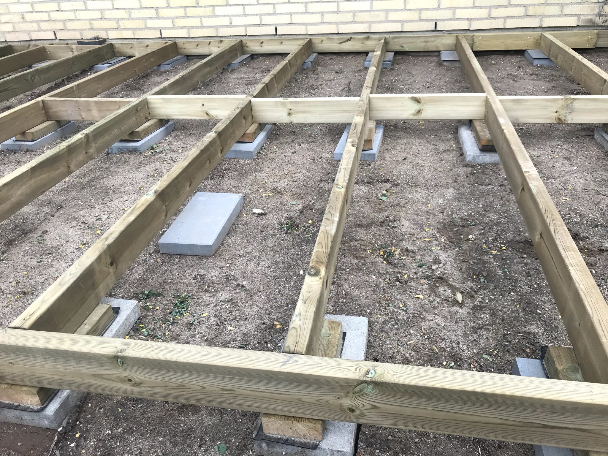Altanen är 12 x 3.7 meter och ligger på betongplattor. 120 mm reglar på cc 60 som skall få 28x145 trall ovanpå.