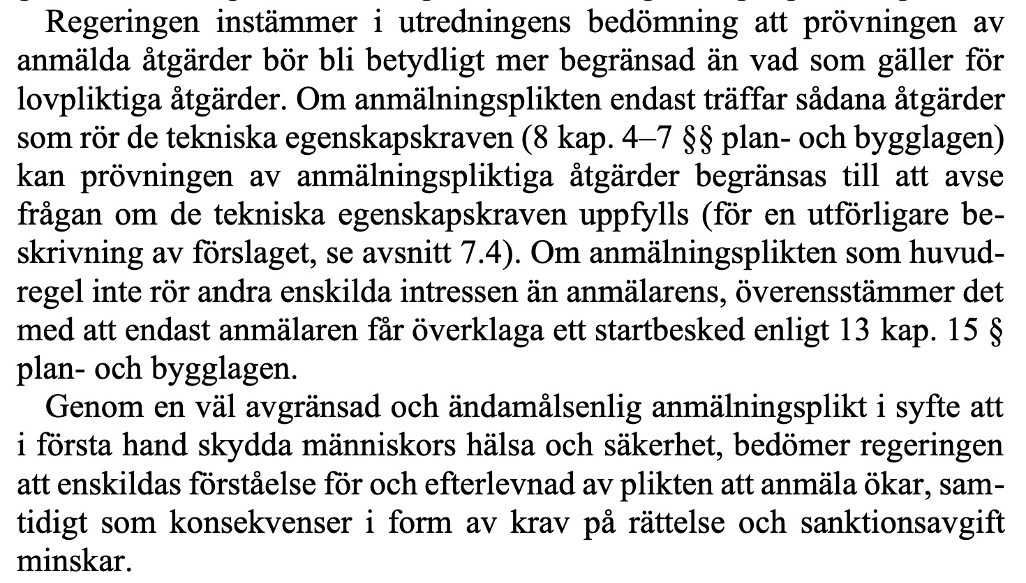 Ja regeringen tänker stryka ned omfattningen av anmälningspliktiga åtgärder till de åtgärder som berör tekniska egenskapskrav enligt regleringen i 8 kap. 4–7 §§ PBL. Alltså enbart saker inuti byggnaden. Propositionen s 217:K Kallebo skrev: