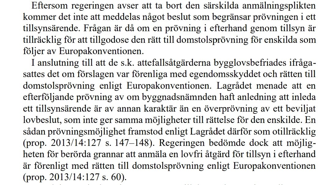 Tillsynen ska ju agera så att eventuella rättelseförelägganden står i proposition till åtgärdsbehovet utifrån allmänna hänsyn. Detta krav saknas ju helt vid bygglovsprövning där de mest anala saker kan drivas av handläggarna helt utan överväganden om de spelar någon roll. Så att flytta prövningen från förprövning till efterhandsprövning (för den som har otur och anmäls av sin granne) är i sig en rejäl liberalisering.