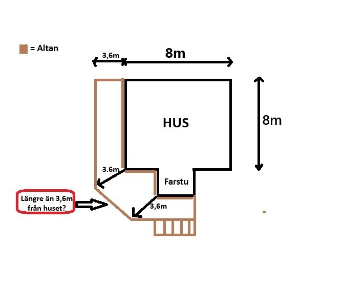 Min ritning är ritad i paint och är absolut inte enligt skala 😅 Men måtten som jag försöker visa på min skiss stämmer i verklighetenZ z_bumbi skrev:Du har fel mått i din ritning. De pilar som utgår från de två hörnen vid det aktuella området är längre än 3,6 m och om det är 45 grader så är det ca 5 m. Detta är för t ex plank under 1 8 m godkänt om det är i anslutning till en uteplats (det finns ingen definition på en uteplats utom där man vistas ute).