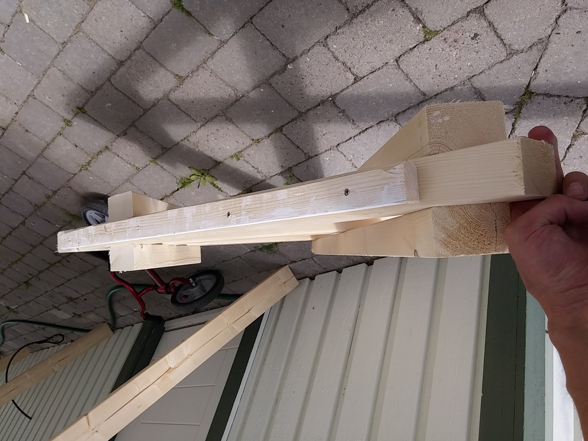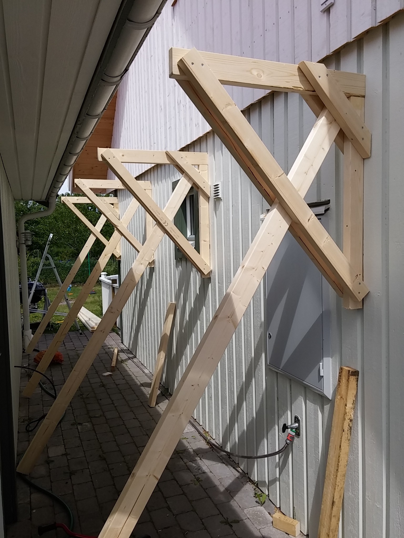 Tackar för tipset om knekten. Material jag använde var 45*70 & 45*90 och sedan 45*195 att gå på. Tog totalt 3h att hämta material och bygga ihop till 5 knektar. Materialet kostade 1700 på byggmax.Canuto skrev:Så här ser en "knekt" ut, tror jag. Jag använde själv sådana på 80-talet när jag bytade ett stort gavelfönster.