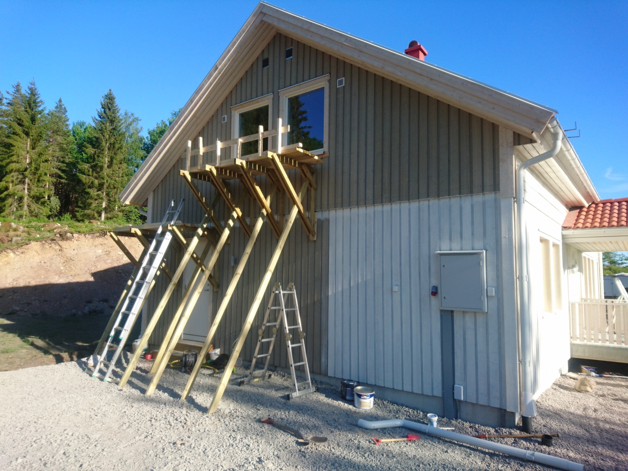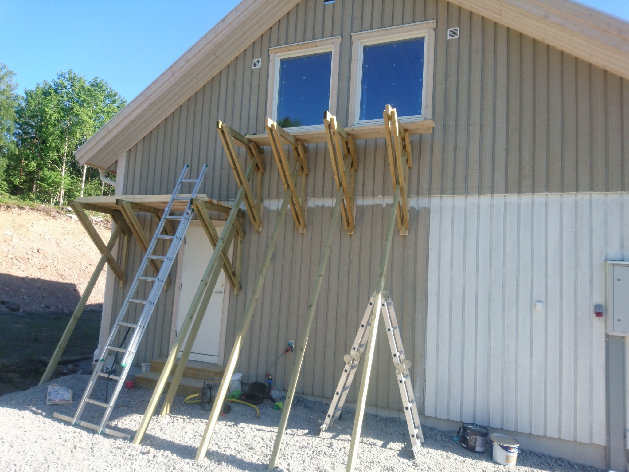 Några tipps från en snickare.Tänk säkerhet när ni bygger ställning. Ex ställningsplank ska vara av gran och av högsta konstruktionsklass,samt "provhoppad" för att vara godkänd. Lägg upp planket på 2 bockar upp och hoppa på den, vänd och upprepa proceduren. Håller planket för detta är den godkänd som s-plank. Knapar, snesträvor, och andra detaljer i ställingen ska spikas INTE skruvas detta pga att skruven förvarnar inte innan det brister, det gör spiken. Ha respekt för dom små höjderna. Vet en kille som klev snett från en 2stegsbock,landade på hammaren och sitter idag i rullstol. Tänk alltid säkert