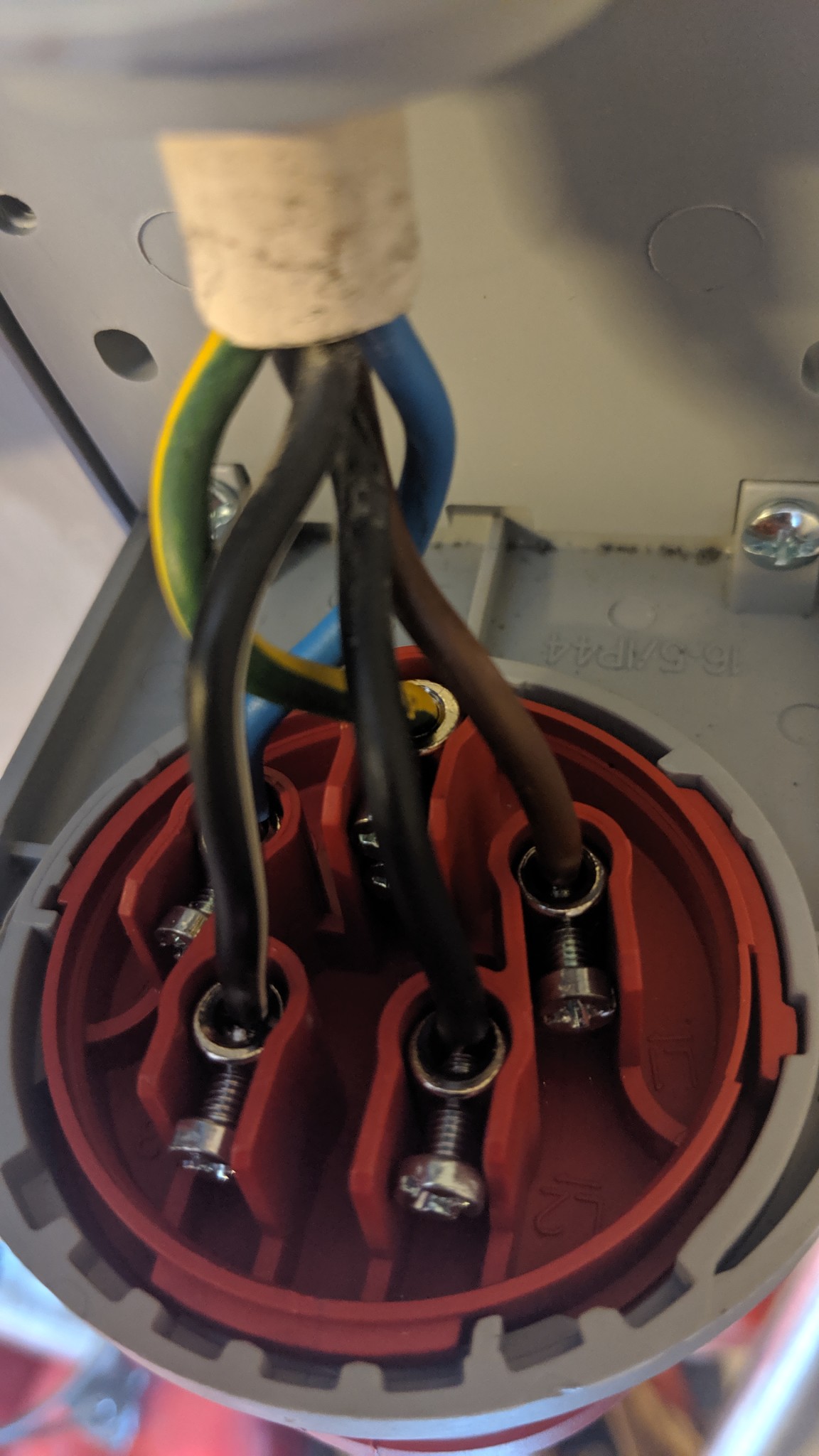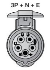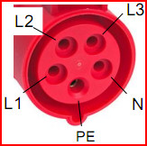 Vid inkoppling är det först och främst kritiskt att faserna, nollan och skyddsjorden hamnar på rätt stift. Det finns en svag märkning i plasten. Nedan är ett exempel på CEE 416.