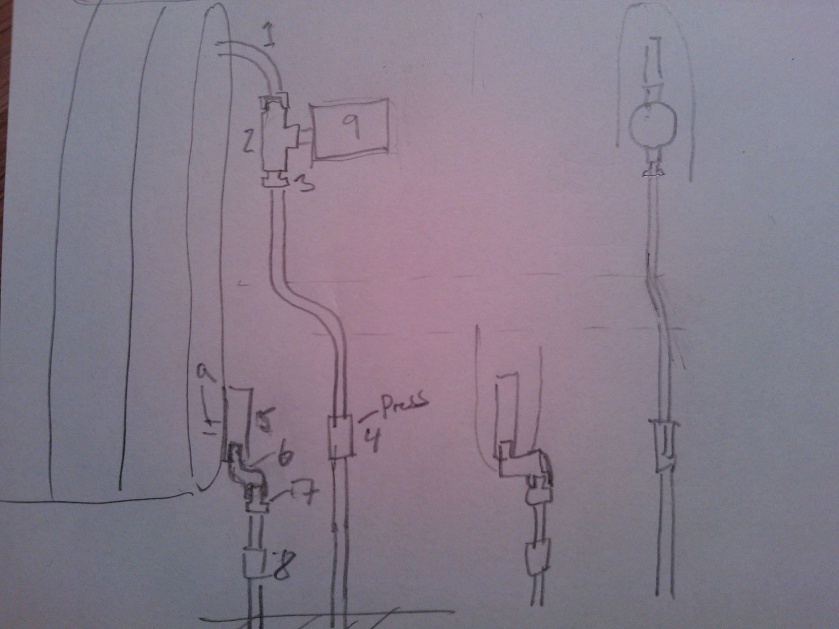 Det ser bra ut tycker jag. Skuiie dock hoppa över pos 6 excenter, enkelt att göra en knäbock och vinkla returkopplingen lätt bakåt, inåt istället blir kanske mer stilrent och estetiskt. Samtidigt göra skarven mot befintliga rör nära golvnivå och på exakt samma höjd, bara lämna 20-30 mm mellan golv och nedre del av kopplingen. Kanske även bättre med två klämringskopplingar för skarv om man inte är van och behöver vrida, passa och kanske göra om delar, behövs ju heller inget pressverktyg då.