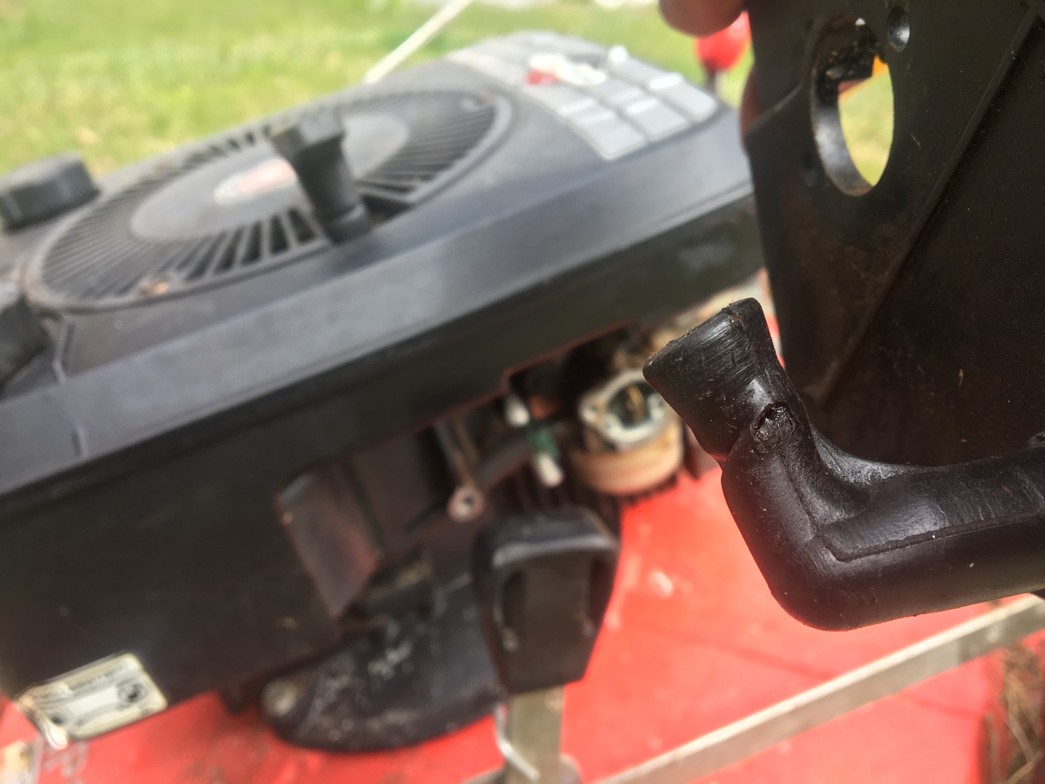 Ok! Väntar med det. Nu har jag börjat med att borsta och blåsa bort gammalt gräsklipp och annat som letat sig in i luftfiltret. Ska kolla om detta hjälper. Det var ju mycket riktigt helt igensatt. Jag upptäckte också ett litet hål i gummikanalen som leder soppa (?) till flottören (?). Men det sitter en bit ovanför botten på kröken, och borde inte innebära nåt läckage. Bara lite sämre tätning kanske mot metallröret som fäster in i gummit. Ska försöka ta ett par förklarande bilder...