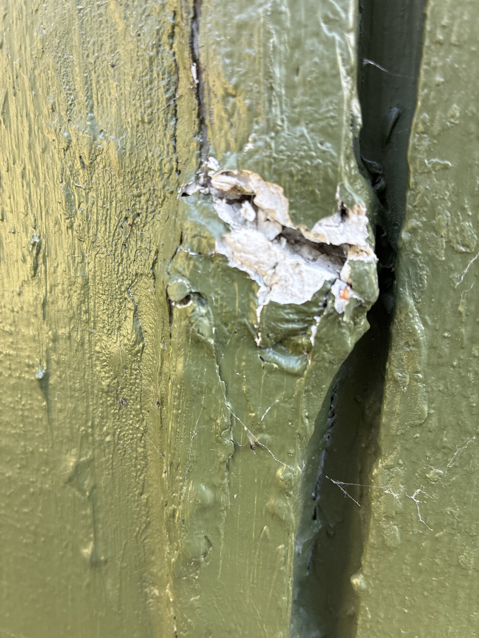 Du menar då plåten som syns på foto 3, den ska vara där i mellan som skydd så inte vattenpåslag ska rinna in bakom panelen nertill. Det med sprickorna som är spacklade,Tja vad göra med det,kanske spackla vidare och måla över. Om du tar en syl och trycker på en del som du tycker är ett angripet ställe och den sjunker in, så kan det vara ide att byta panel. Blir det stopp så kan det spacklas och målas över. Du får då kanske några år till på dig för att byta panel. Ingen katastrof är det troligen nu.