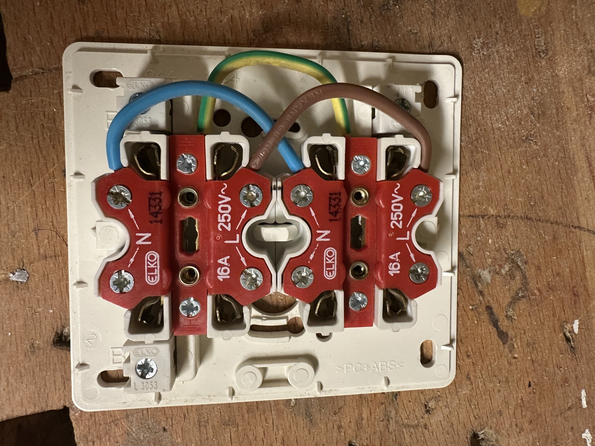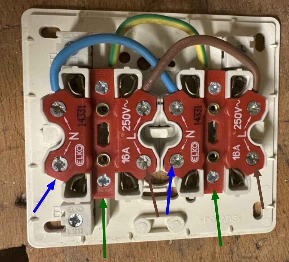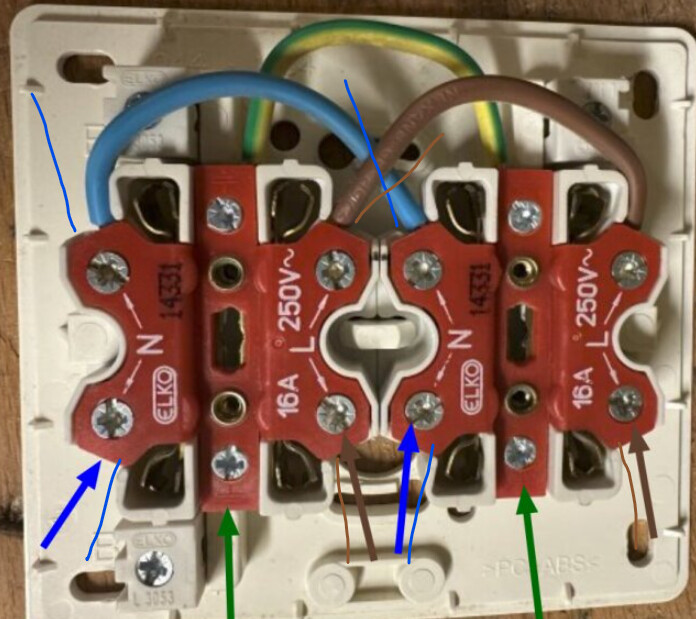 Jag skulle byta ut ett eluttag i köket från tvåbrunnars till fyrabrunnars, men när jag tittade efter hur det är kopplat så såg det inte ut som jag förväntade mig. Det är ju tre kablar av varje sort (fas, jord och noll). Det verkar som att matningen kommer till det här uttaget och sedan grenar upp sig åt två håll. Tittar man på uttaget så har det extra anslutningar för det. Fyrabrunnarsuttaget verkar inte som att det är till för att kopplas på det viset? Jag hittar bara en "ledig" anslutning för vardera fas, jord och nolla. De andra behövs ju för att koppla ihop de båda brunnparen.