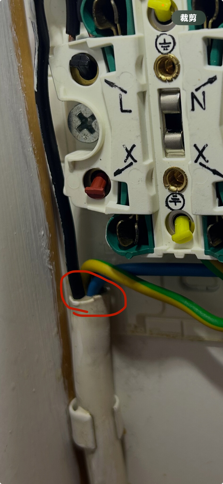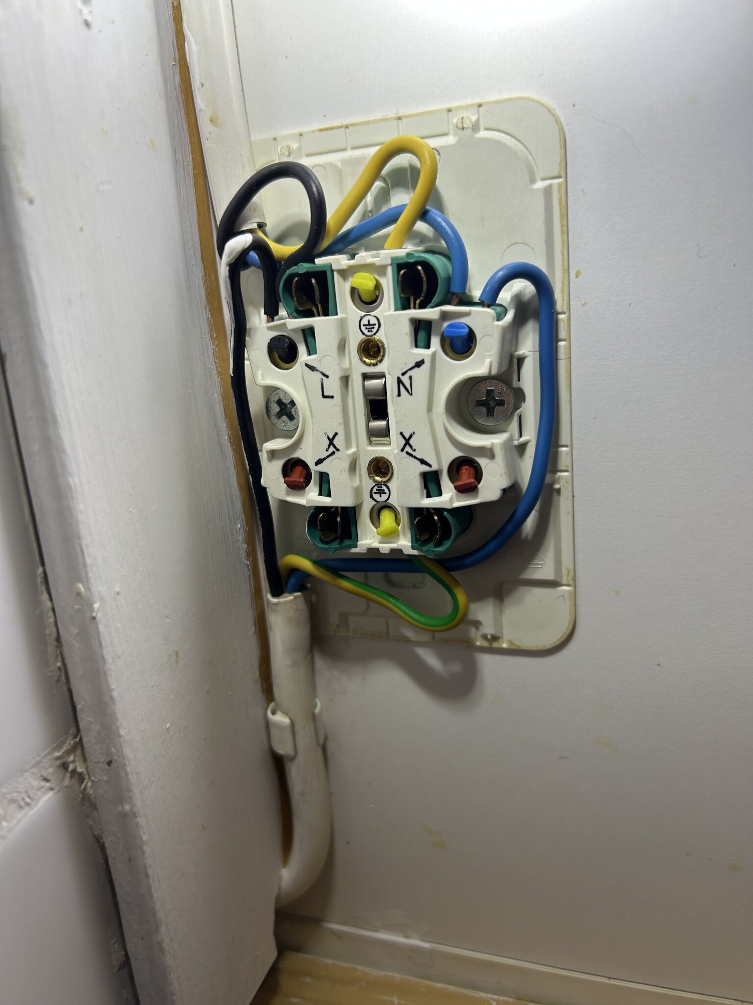 Under köksskåpet har jag ett gammalt 2-vägsuttag (se bilder). När jag öppnade det såg jag att det finns en exponerad fasledare (svart), utan någon isoleringstejp. Jag vet inte om det är tidigare ägare som har gjort detta.