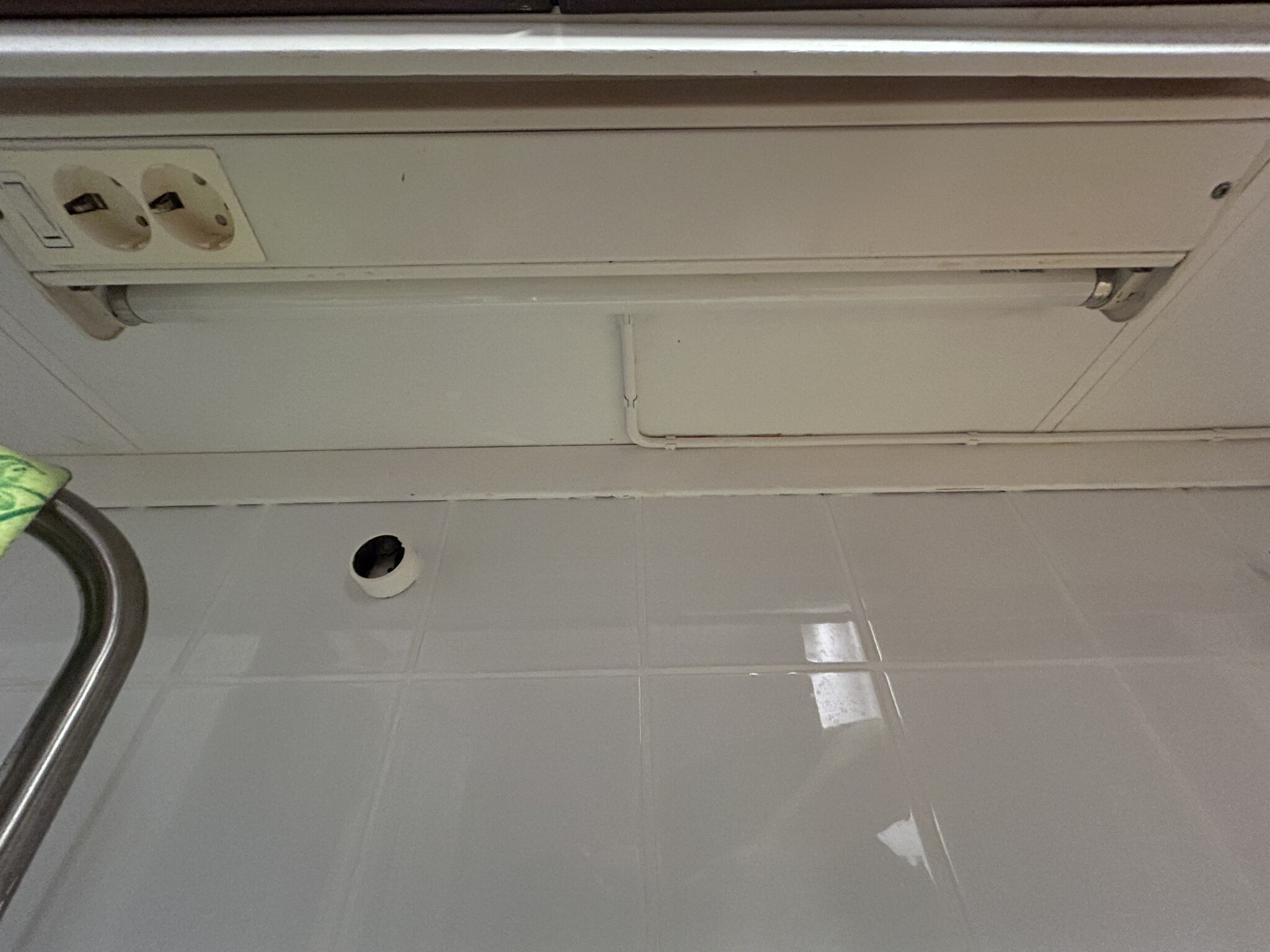Uttaget matar också vidare till belysningen under skåpet, via en fast installation.