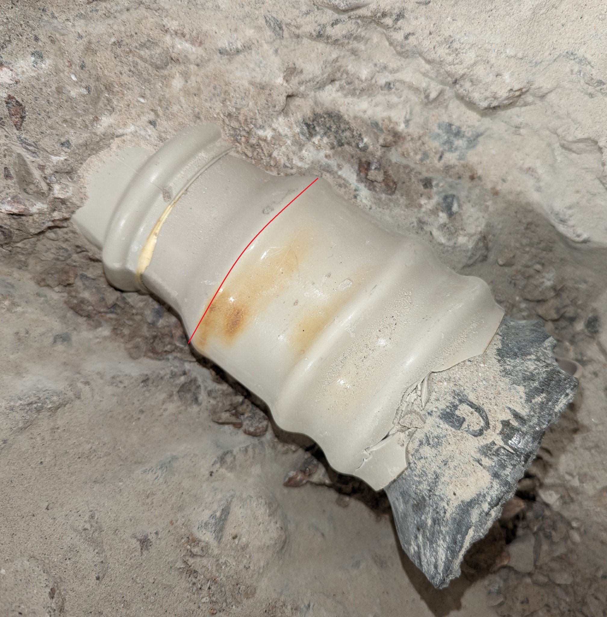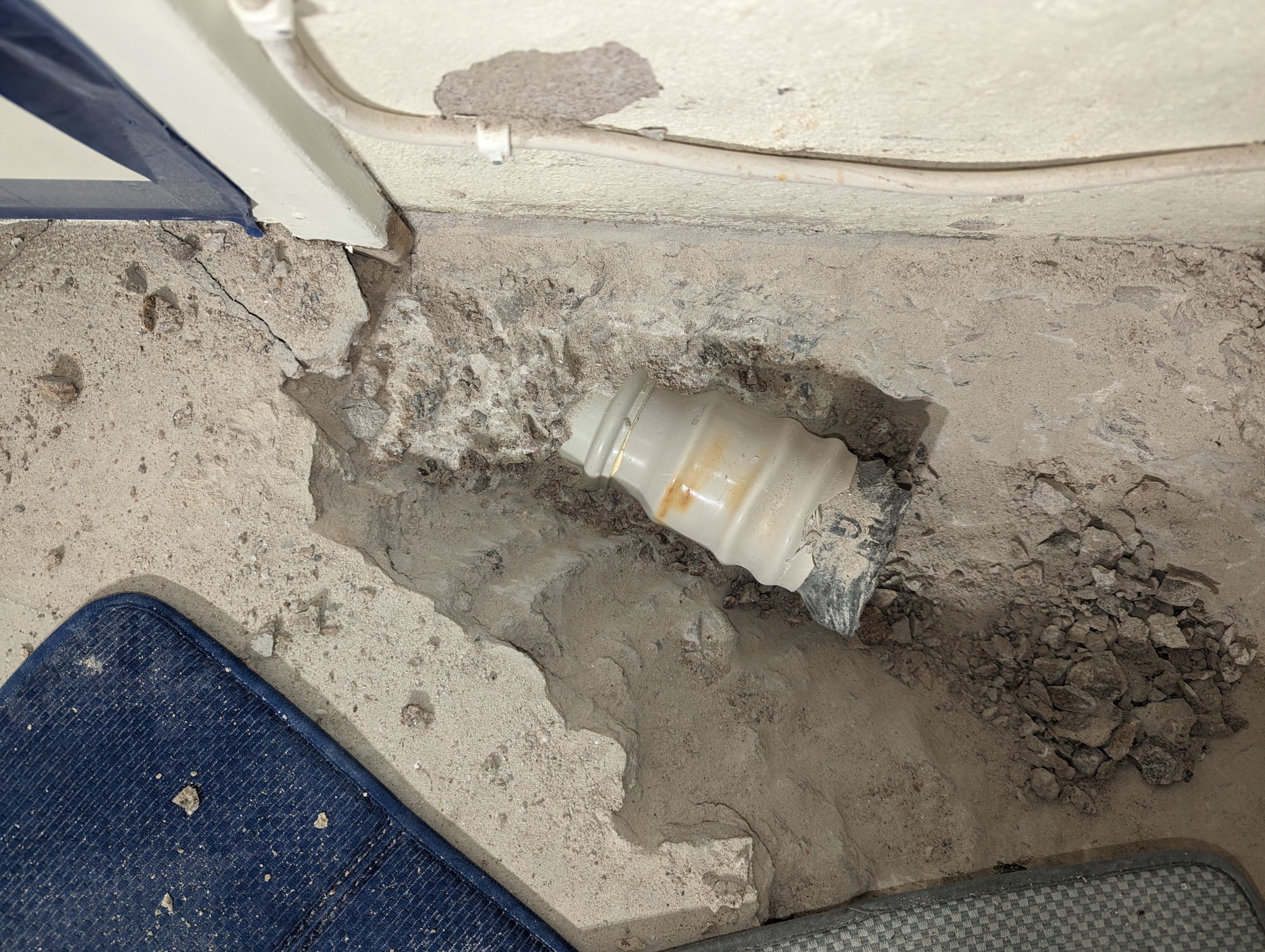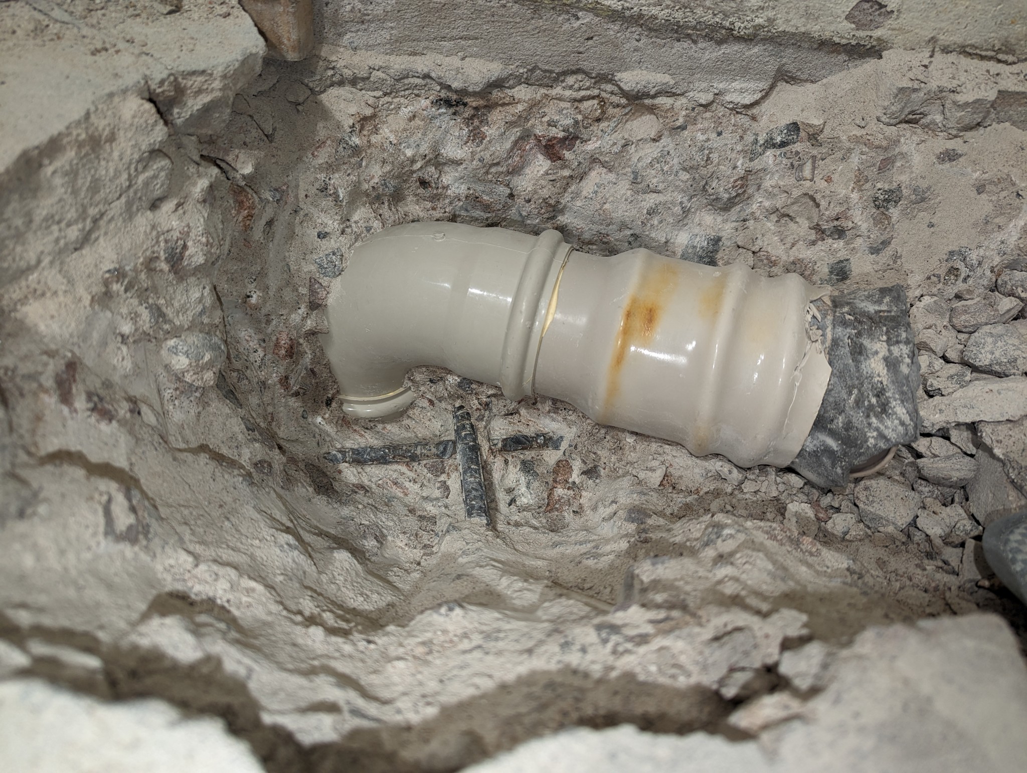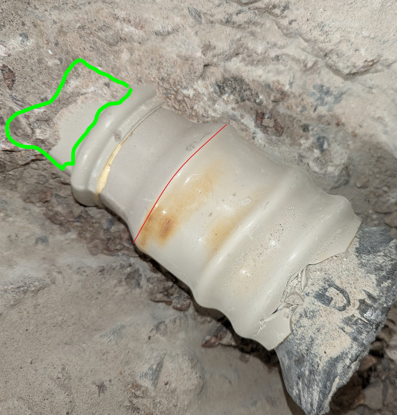 Var tvungen att slå sönder brunnen för att komma åt och nu sitter en mindre del kvar i vad jag antar är en krympmuff (?). Det ljusgula som syns i skarven mot nästa rör är lim? Det röret viker i sin tur av rakt nedåt i höjd med listen/maskeringstejpen som syns på bilden, dvs under väggen och säkert delvis under trägolvet i nästa rum.