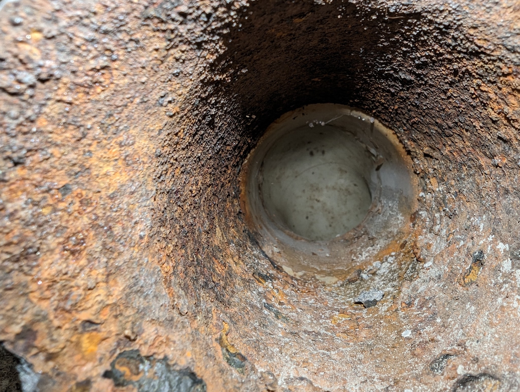 Ah, naturligtvis. Lyckades efter lite möda få loss locket. Stammen går rakt ner i backen. Kan inte se vart den tar vägen riktigt, utan bara att den går uppskattningsvis minst en halvmeter rakt ner. Vinkeln i öppningen blir ju rätt så snäv, så jag kan varesig se eller sticka in nåt att känna med så pass långt ned. Mobilkameran var det bästa jag hade hemmaC cpalm skrev:
