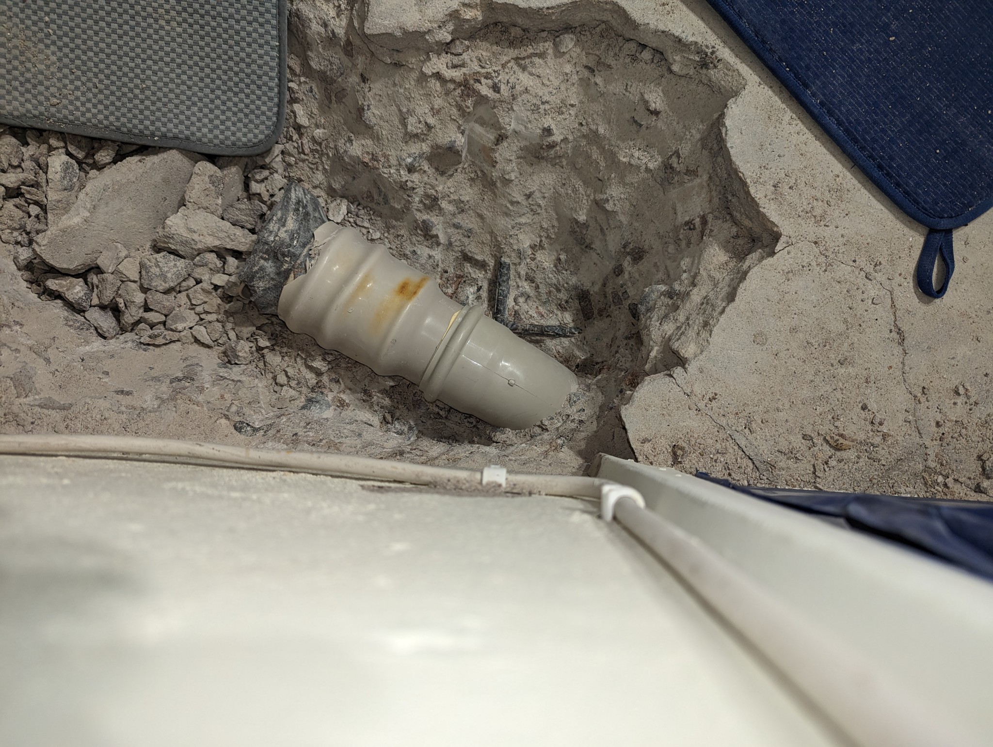 Tack! Utvidgade "gropen" åt alla håll och även på djupet. Allt blev plötsligt lättare. Funkar rätt så bra att bila spår med den platta mejseln längs med röret. Om det är ett par cm betong kvar mellan spåret och röret så vibrerar det nästan loss av sig självt. Det dök upp lite armeringsjärn undertill, men tror det går att arbeta runt dem hyfsat.C cpalm skrev:Av bilden genom röränden att döma är det nog "tyvärr" bara muffänden på en böj som sticker vidare ner i plattan.