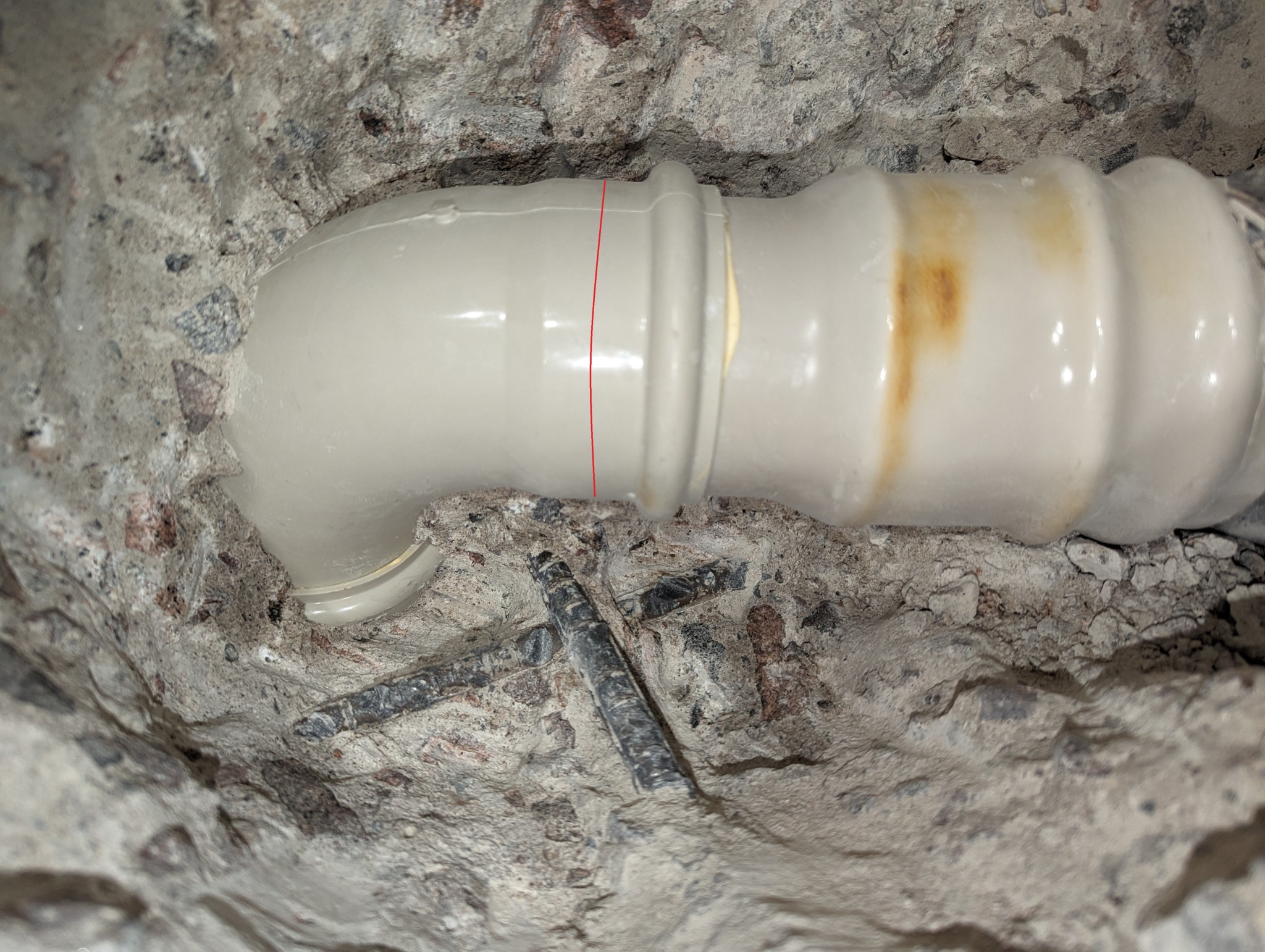 Fick en timme här på morgonen innan dagens övriga måsten drog igång. Som synes är det en 90-graders böj nedåt innan nästa rör är iskarvat. Jag tror röret med böjen är ca 79-80mm i ytterdiameter på den lite bredare delen närmast änden (markerat med röd linje på bilden). Kom inte riktigt åt met skjutmåttet, innan jag fick avbryta, så det kan möjligen vara någon mm mer, men inte mycket.