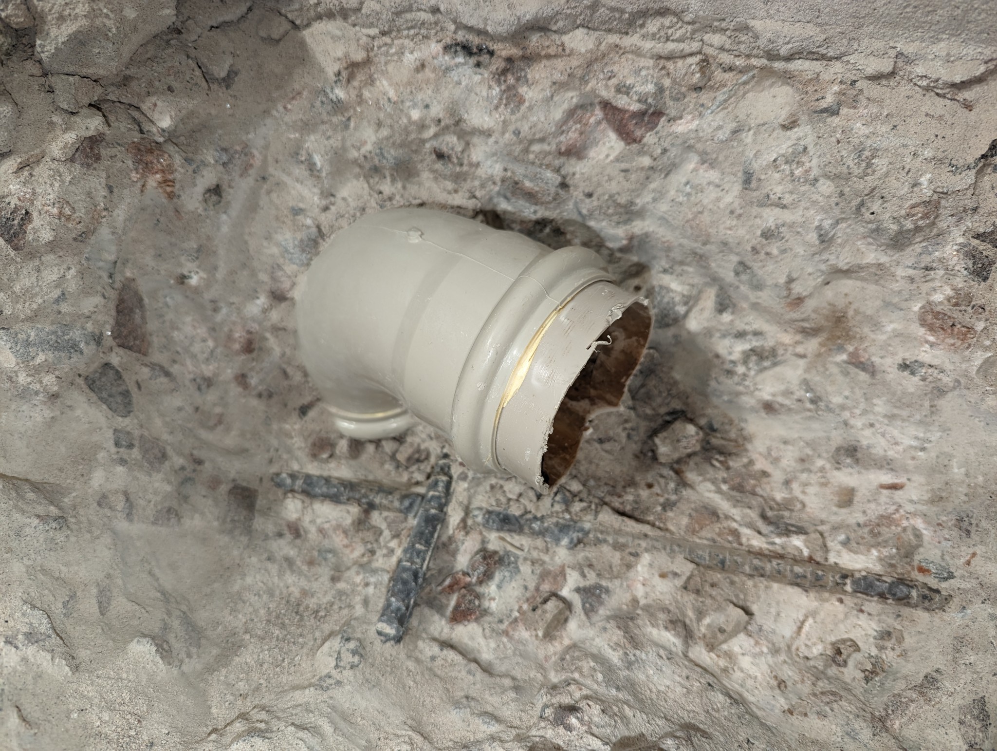 Det syns inte riktigt på bilderna, men jag är i princip inne i väggen och bilar när jag kommer till muffen. På andra sidan väggen finns som sagt ett underventilerat trägolv som vi inte vill riva i. Vad händer om jag spräcker muffen?