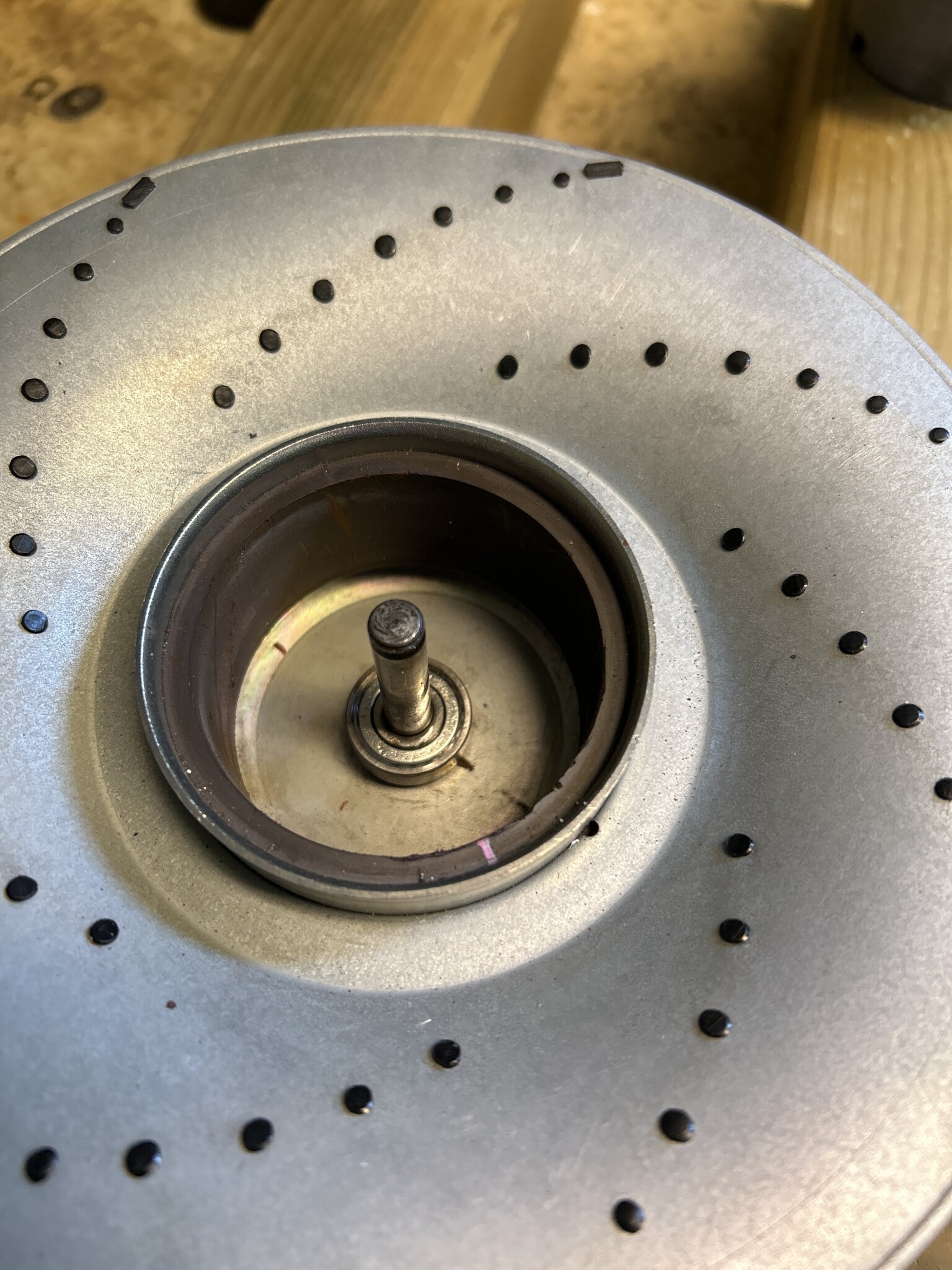Resultatet: när jag slog i lagret i botten, blev det lite glapp när jag satte ihop allt. Dvs, jag behöver åka och köpa fler taggbrickor, så det är två på varje sida om snurrgrejen, för att få stabilitet.
