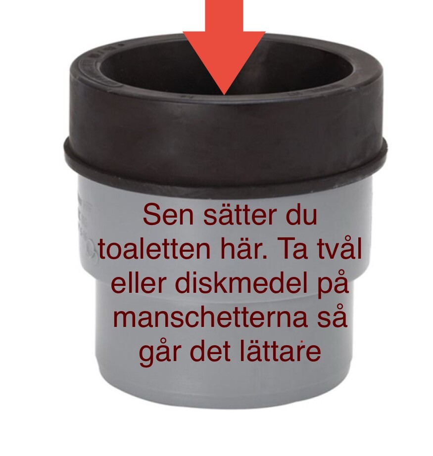 Hej, sorry att jag fortsätter fråga.. Har köpt WC-anslutningen du länkade till nu, men är på jobbet och har inte provat ännu. Blir fundersam, kommer den passa ned i stosen med manschetten (på min bild) eller måste manschetten tas bort? Och då måste jag ju i så fall limma eller täta med silikon? Har försökt hitta diametrar på toans "porslinsrör" men inte hittat och har heller inte hittat diametrar på stosen..
