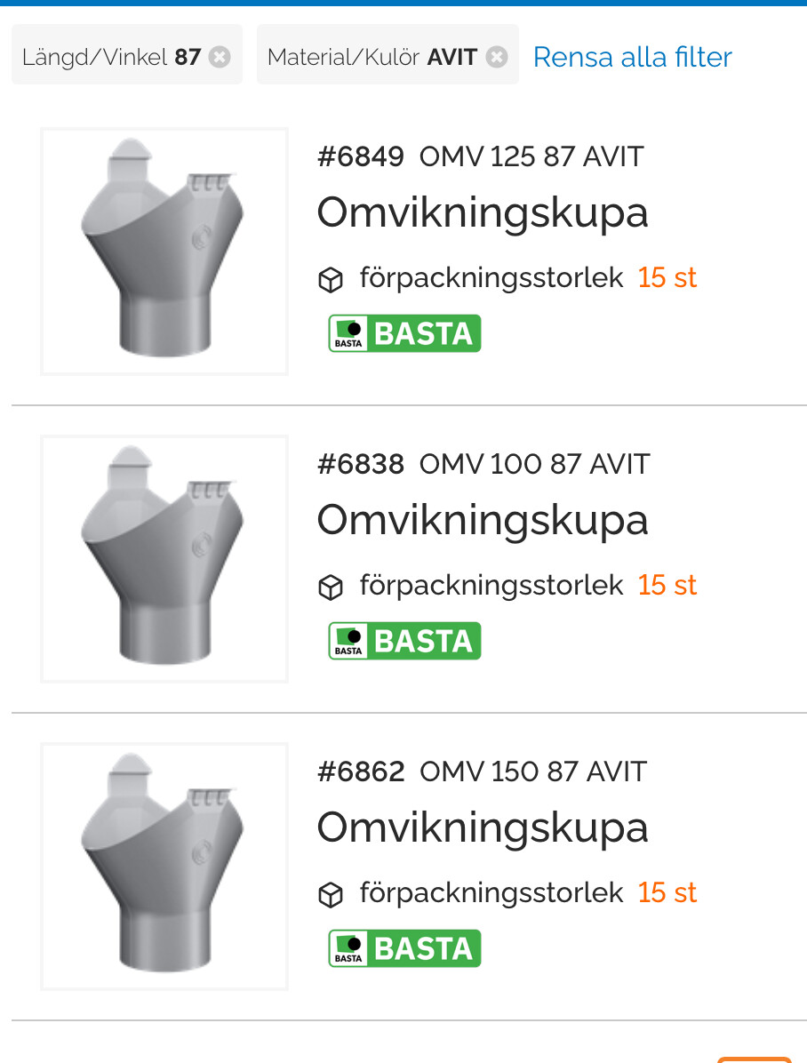 Byter omvikningskupa (1). Det finns olika kombinationer av hängrännebredd och stuprörsmått. Byggmarknaderna har troligtvis 125/87 på hyllan. Övriga kan en plåtslagare fixa. 90 mm brukar egentligen var 87 mm om jag inte minns fel.