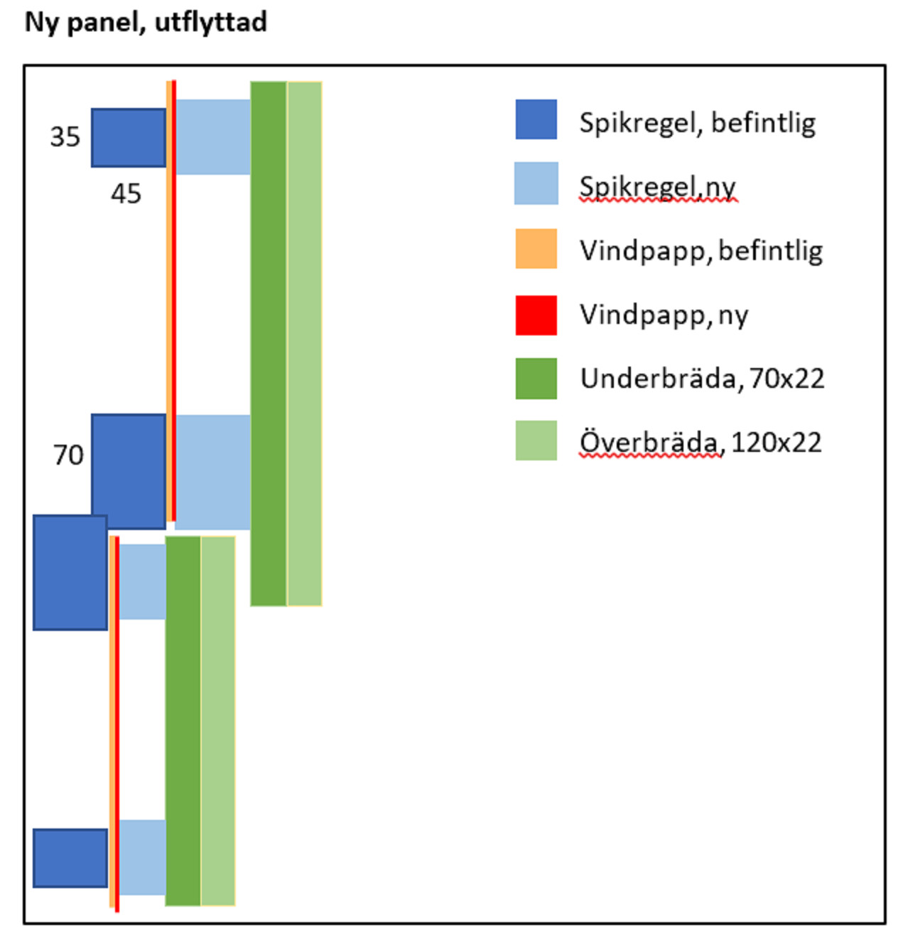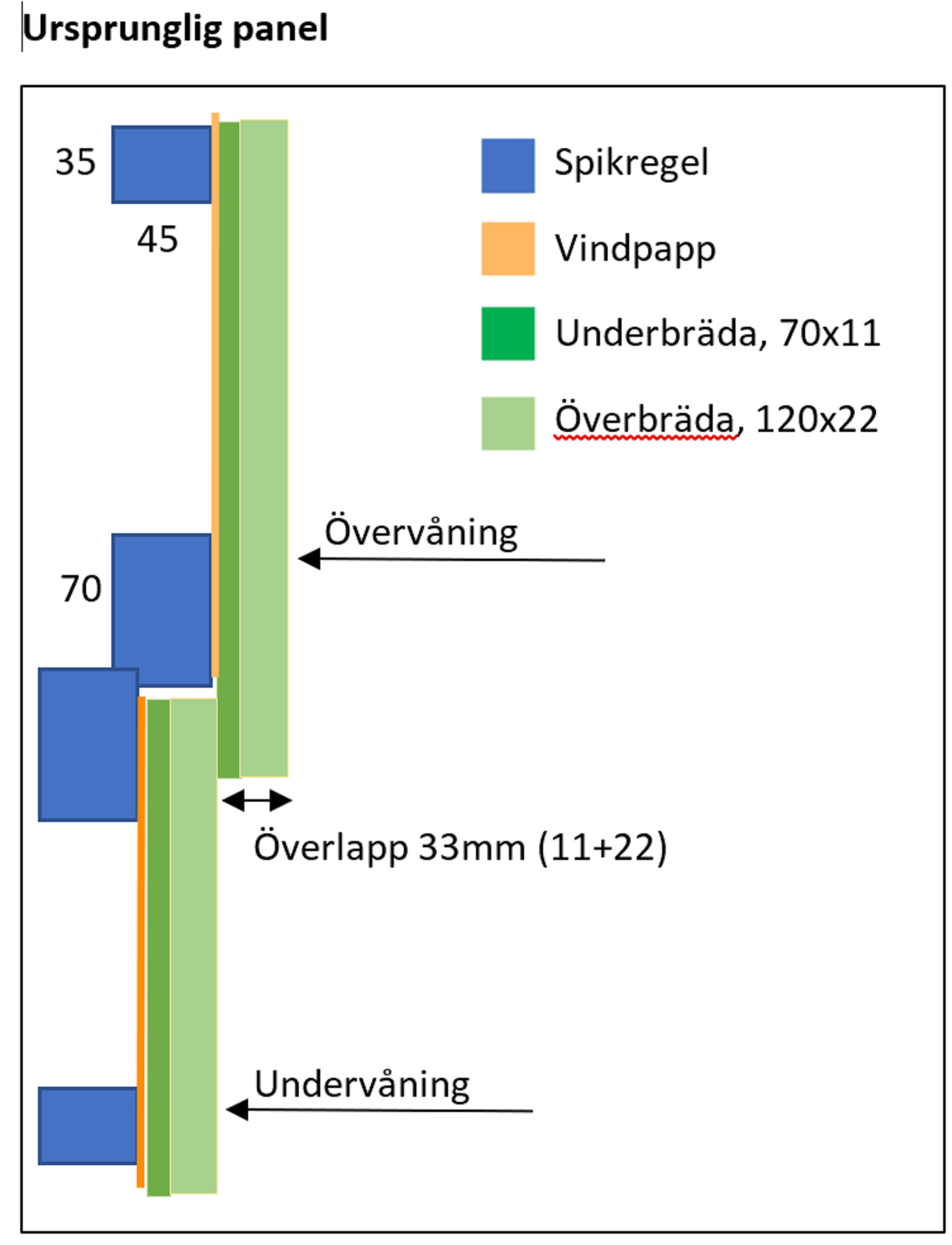 Till saken hör att de gamla underbrädorna var 11x70 och jag tänker byta till 22x70 vilket leder till att jag nu behöver större "djup" i överlappet för att brädorna för undervåningen skall få plats under brädorna för övervåningen. Jag tänkte lösa detta genom att ha olika dimension på spikläkt uppe och nere.