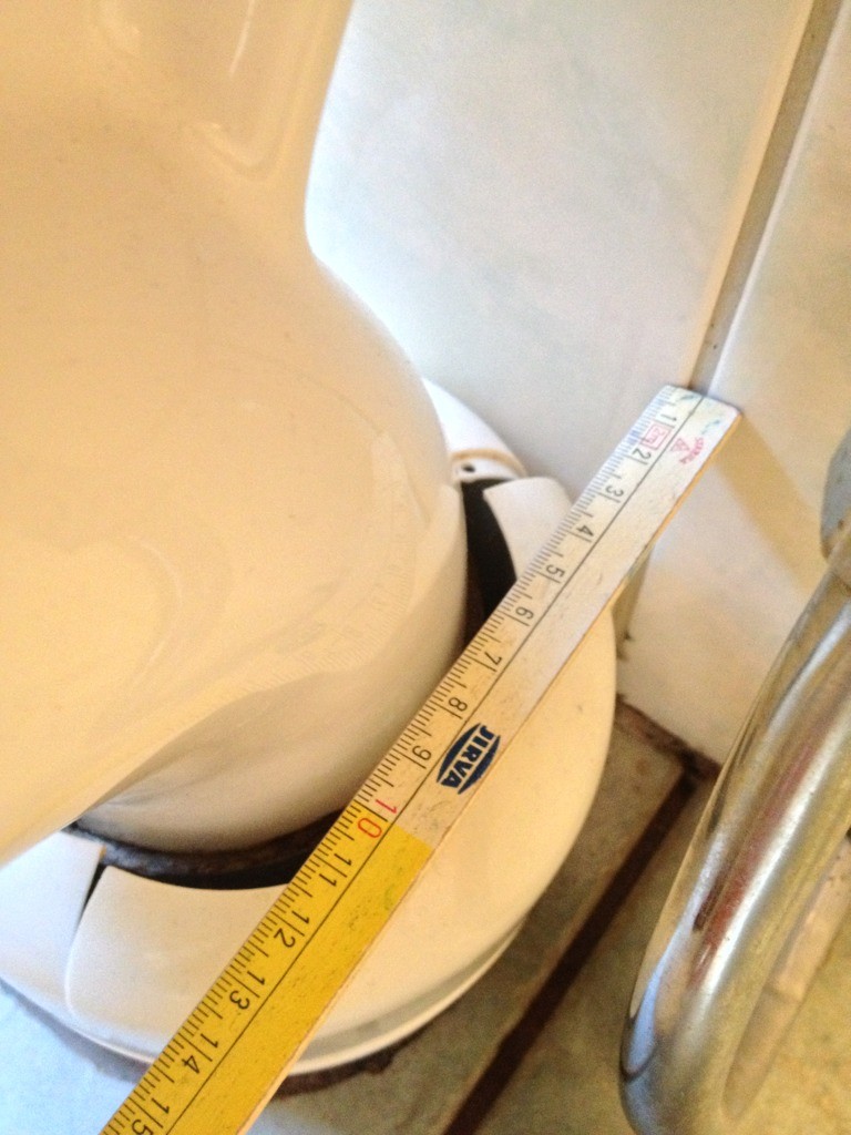 (Jag gjorde misstaget att inte kolla upp avståndet till väggen då jag skulle byta toalettstol hemma hos svärmor. Vi åkte ut till henne en sen lördageftermiddag, 3,5 mil ut på landet, med en ny toalettstol. Jag skruvade loss den gamla och stängde av vattnet och kopplade bort anslutningen.