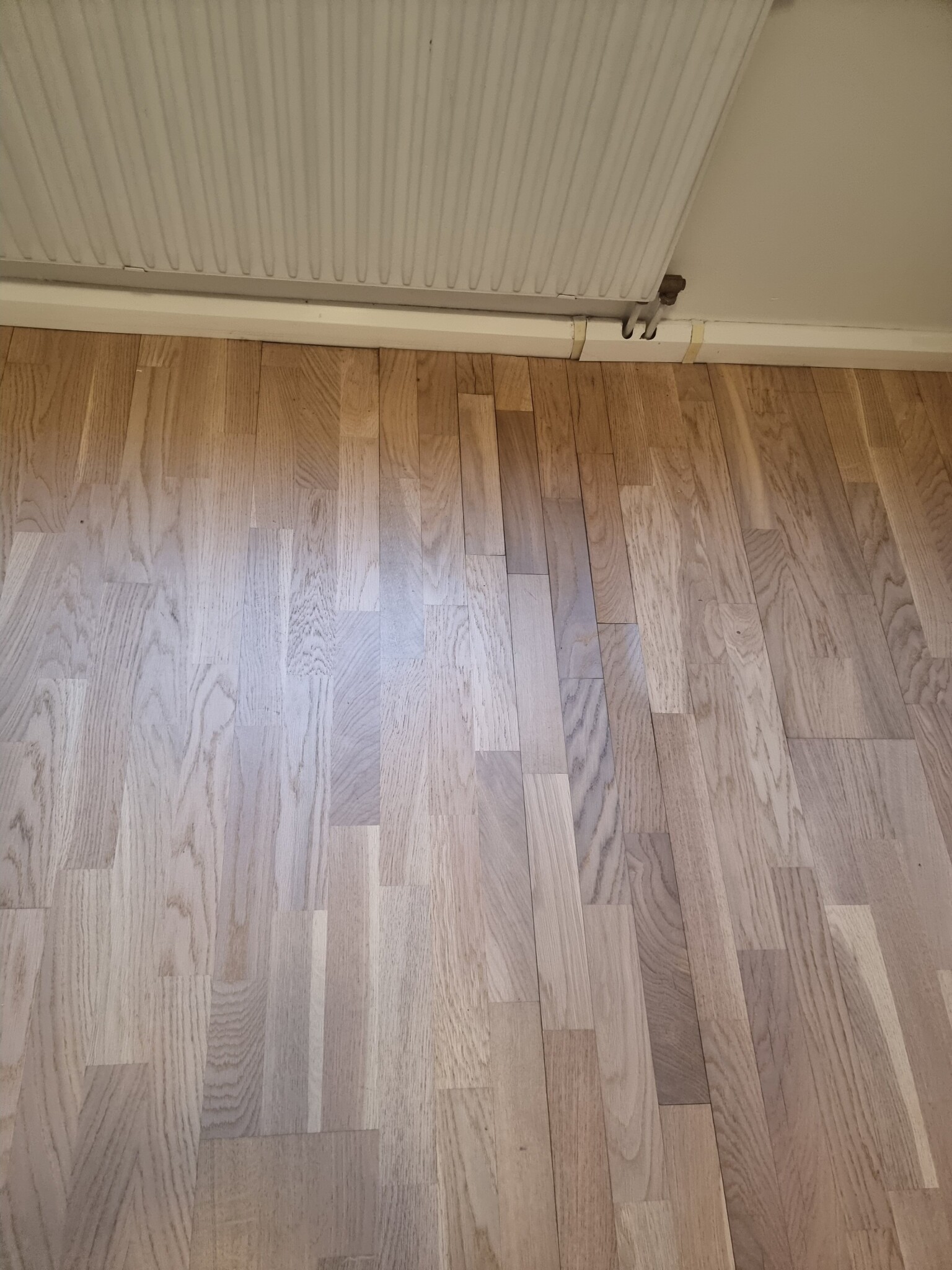Jag vet inte vad det är för som hänt med golvet, det ser ut att vara en gammal vatten-/fuktskada. Det verkar endast vara på ovansidan då jag har fått loss översta lagret av en bit av en bräda som ser värst ut och på trät under ser det helt ok ut, man märker knappt något. Jag har tidgare mätt med fuktkvotsmätare från clas ohlson flera gånger och den visade runt 9-10% om jag minns rätt, vilket ska vara ok. Och det kommer ingen konstig lukt. Så en fundering jag har är att eventuellt sätta dit en plastmatta men vet inte om det är en bra idé då brädan som är värst har ändrat form och man kan känna det när man går på den.