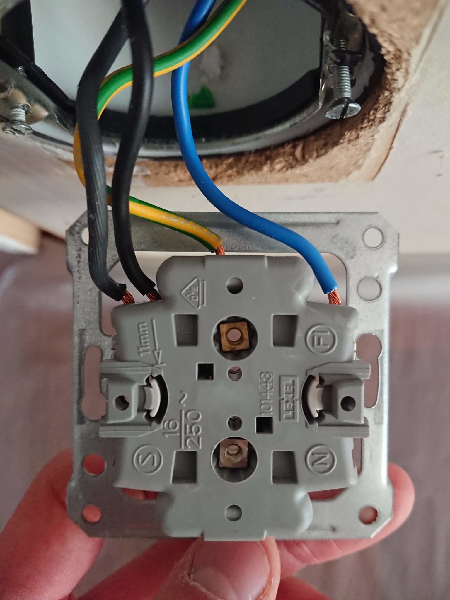 Nolla och jord finns redan i armaturdosan dit röret från dosan troligen går och från brytaren går en tändtråd. Bara fasen är hämtad i uttagsdosan. Varrför?? ja det kan man fråga sig men jag har sett det mer än en gång.