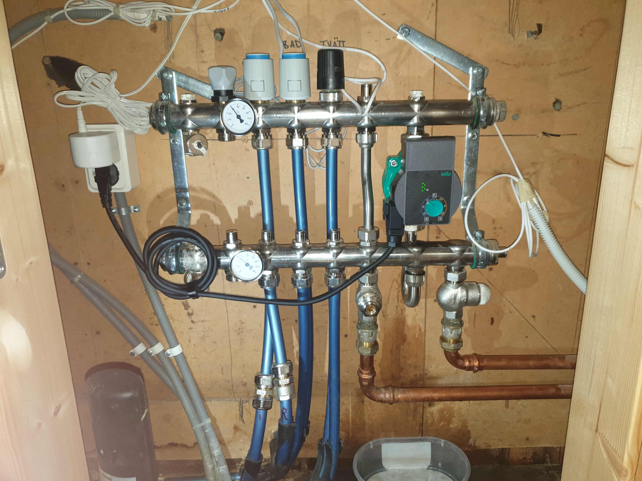 Börja med att stänga ventilen som är på det nedre röret, håll reda på hur många varv du skruvar och sedan den vita till höger, lika med den så att du får samma värden vid återställning. Öppna avluftaren, den vita ovanför pumpen, då ska det sluta rinna vatten om dom stänger. Kommar det vatten hela tiden från avluftaren så måste du stänga närmare värmekällan om det finns ventiler/avstängare på dom matarrören.