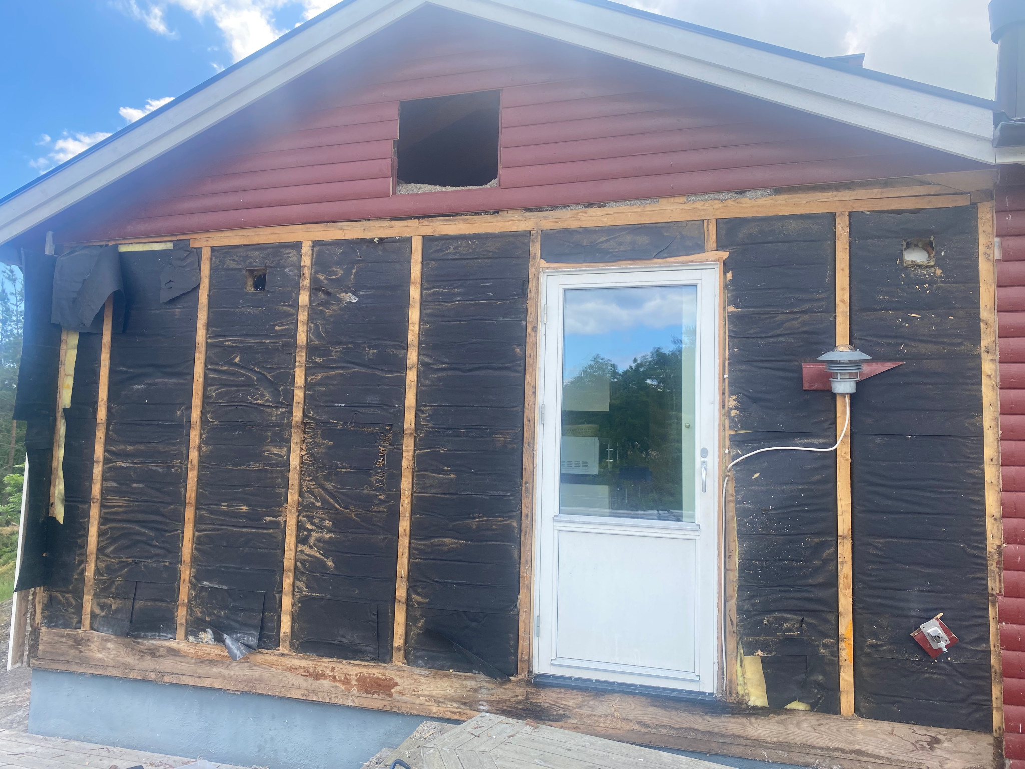 Det här är norrsidan på mitt fritidshus. Det byggdes 1960, men den här delen är tillbyggd sedan dess. Någon gång på sjuttiotalet, tror jag. Jag planerade att måla i höstas, men upptäckte då att vissa panelbrädor var lite ruttna. Jag bestämde mig i stället att byta panelbrädorna, och där är vi alltså idag. Det finns ingen ångspärr i väggen och ingen luftspalt. Stockpanel. Huset har krypgrund. Vi har vintervatten och kommer ut ibland på vinterhalvåret, men inte speciellt ofta.