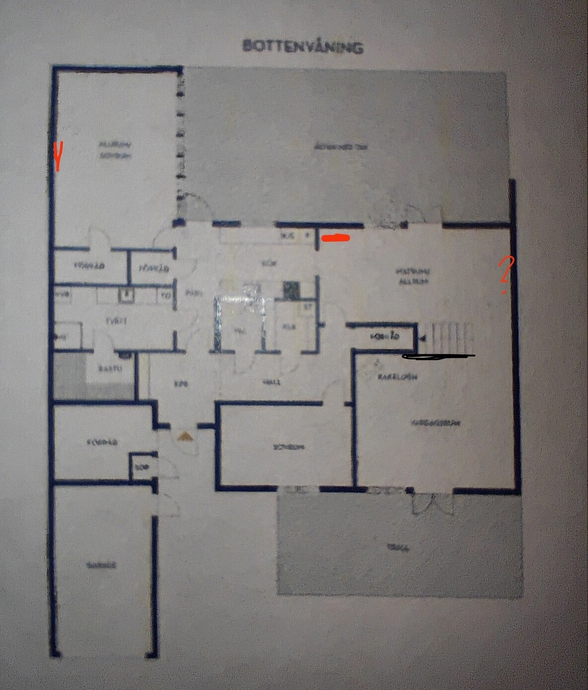 Bilden visar var pumparna sitter idag och var vi eventuellt skulle flytta den till. Det gäller det röda strecket som är vid kök/matsal. I sovrummet sitter ytterligare en som har god effekt.
