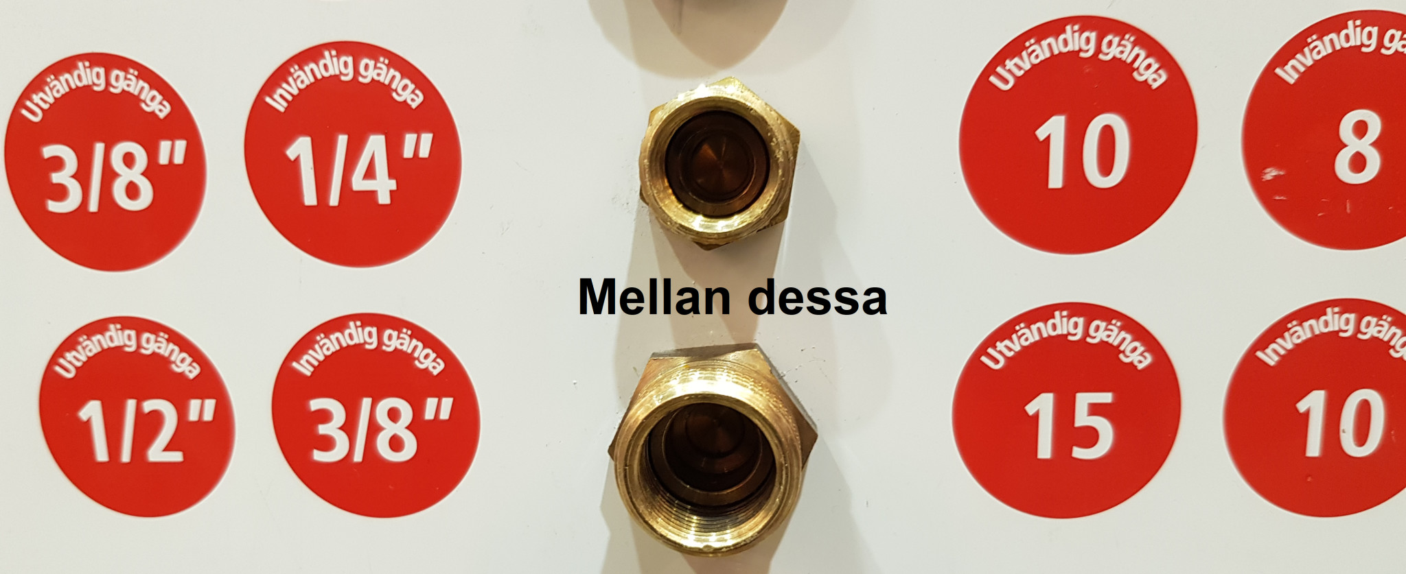 Efter att ha kontaktat en lokal VVS-firma (som inte kunde hjälpa till), så blev det ett besök på Ahlsell. De hade inte delarna hemma, men kunde specialbeställa från Danmark. Av en ren slump hittade vi en sexkantsnippel på Hydroscand, av typen M18 till G1/2" (eller G15 / R15). Den passade nästan perfekt, det behövdes bara lite gängtejp för att den skulle hålla extra tätt.