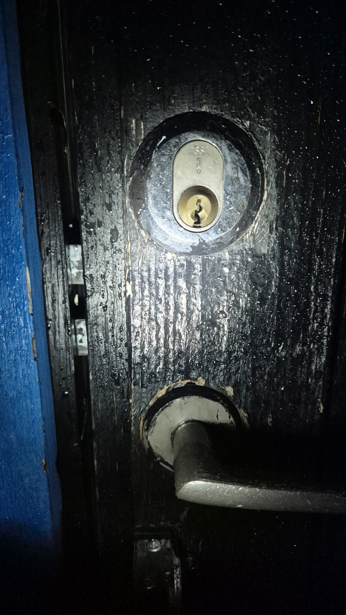 Som det är nu så går det inte att komma in i förrådet, så låset måste bort och ett nytt av lämplig sort monteras. Det senare momentet borde jag kunna hantera, det har jag gjort förr, men det här vet jag inte ens var jag ska börja. De två förslag jag har hittills känns inte så enkla.
