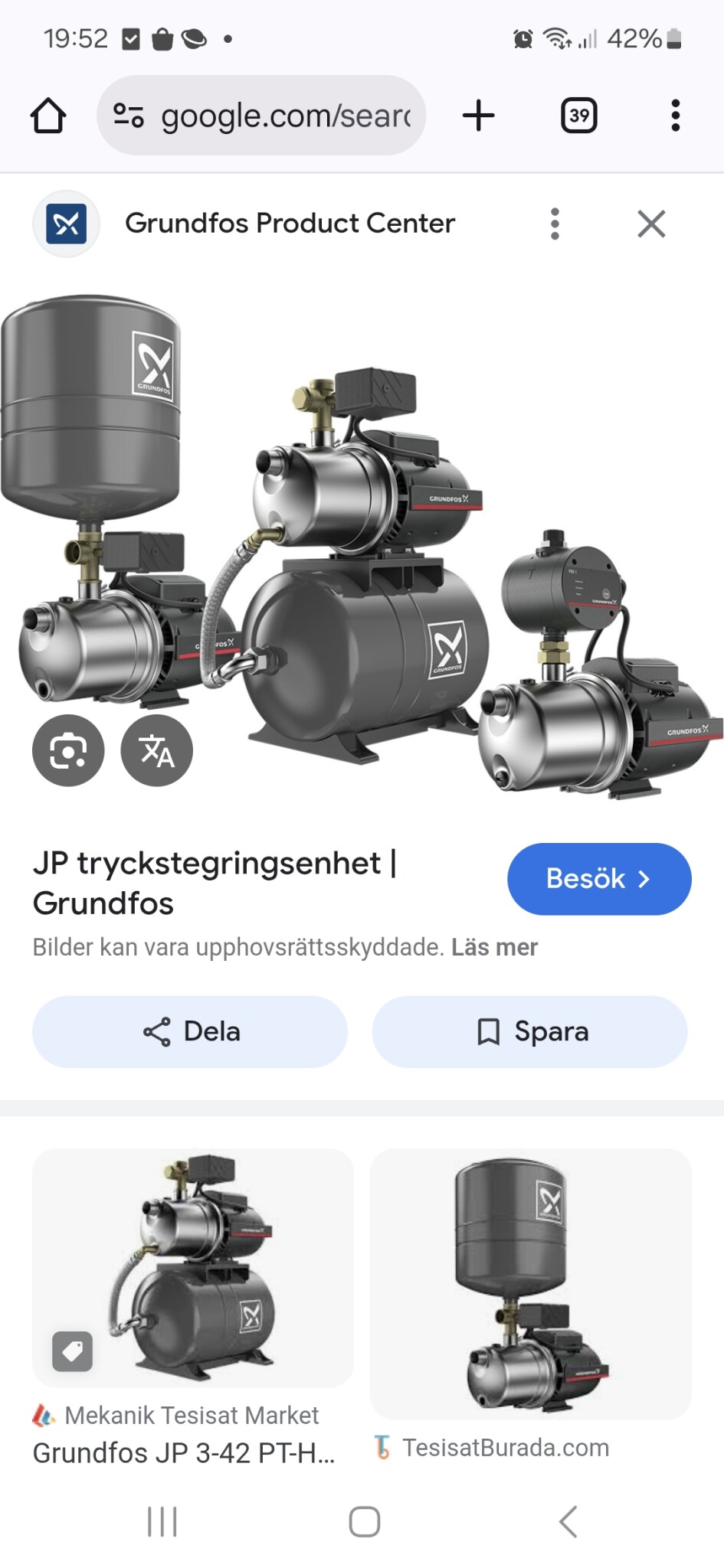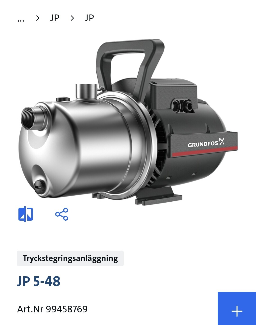 Jag har tyvärr redan en JP5-48 hemma (snabbt felköp) men utan tryckventil och tank, vem kan tänkas ha sådana att montera ovanpå pumpen?J jonaserik skrev:Jeppköp en pumpautomat, men den ska vara godkänd för dricksvatten, många påbilliga varuhusen är inte det. Med en ny pumpautomat som innehåller alla delar för drift är inte fel, sen att detär ett litet kärl extra gör inget för driften. Den korta slangen kan du använda på sugsidan och köpa en ny som räcker på trycksidan,blir kanske lite längre där. Slangar finns på varuhusen har jag för mig. Bara söka på flexslangar.1tum eller 25 mm