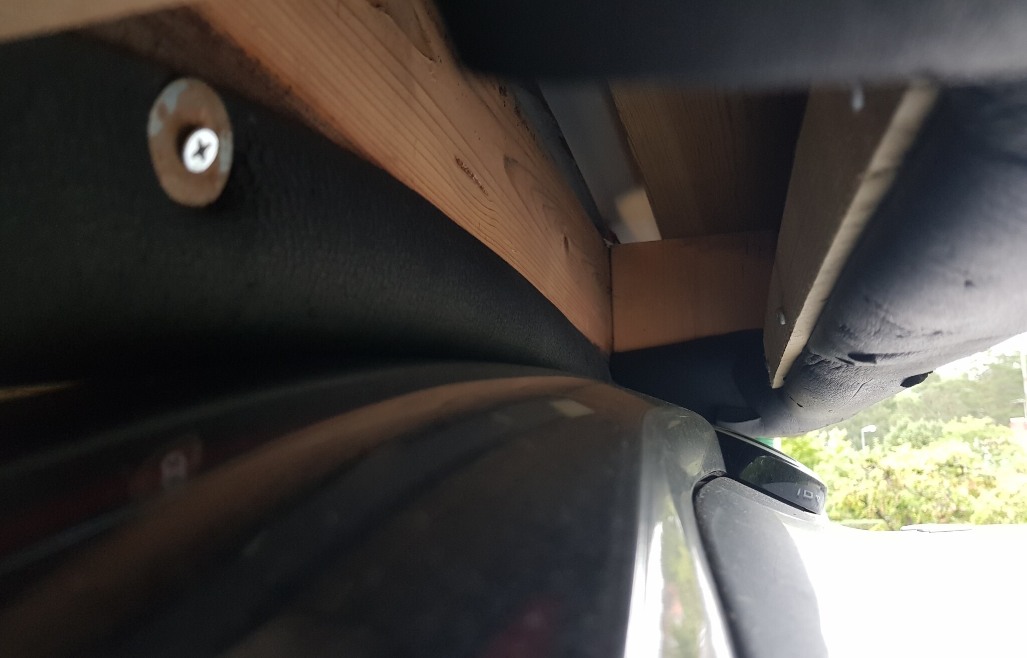 Har två takbjälkar längst ut med ett litet mellanrum, och beroende på hur bilen hamnar i Carporten slår den alltid i någon av dessa.
