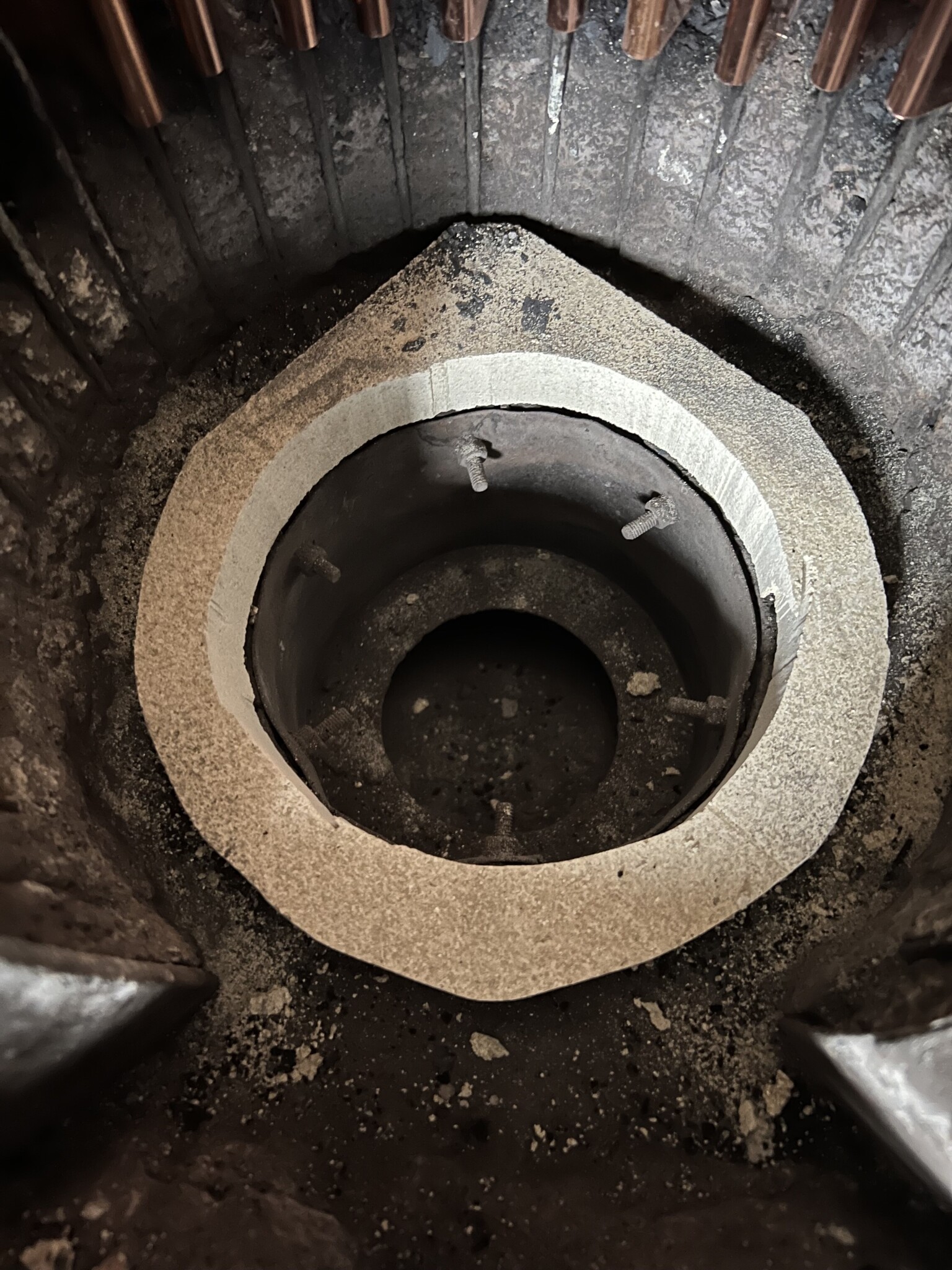 Tyvärr inget han visat mig men han talade om det och beskrev att det hade gått bra. Just den runda formen som Thorvald kallade "logisk eldhärd" är gynnsam om man eldar i en cylindrisk eldstad. Trixet för att få kopparkaminen att funka optimalt diskuterade vi flera gånger och det blir en balansgång mellan att låta de varma gaserna/lågorna stryka kopparlamellerna och hålla hög temperatur. För låg temperatur gör att en del inte förbränns och sotar i stället.T tjr skrev:Tack, här kommer då en bild på det rejäla schaktet mellan härd och asklåda. Det följde med ett roster i massivt svartjärn (svårt att veta när den tillkommit) som placeras på bultarna/insticken. Skillnad i diameter gör att luft och aska har möjlighet att passera mellan roster och schaktvägg.
