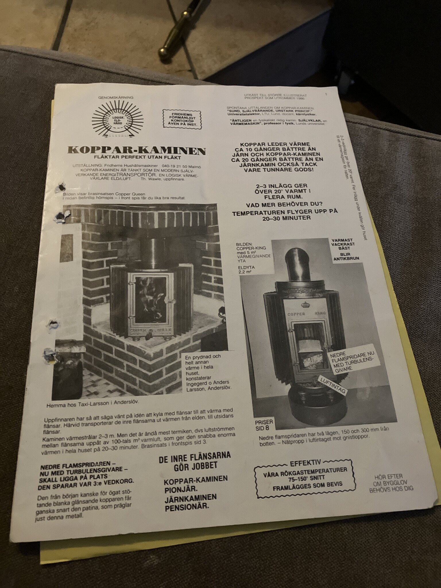 Tack @Hillevihem ! Kul att se och läsa, noterar att dubbla "flamspridare" (varav den nedre "nu med turbulensgivare") och piasavasotborste för sotning (varje dag!) ingick samt "modulskorstenar" i rostfritt kunde köpas till (650kr/m). Jag lyckades inte finna något datum på dokumenten.H Hillevihem skrev: