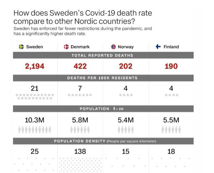 Med det sagt är jag inte övertygad om att Sveriges strategi i slutändan leder till färre andel döda än t.ex. Norge. Det KAN vara en mer livsräddande strategi att stänga ner mycket mer och hoppas på mediciner, vaccin eller att viruset muterar till något mindre farligt av sig själv, innan landet tagit ihjäl sig självt pga all nedstängning.