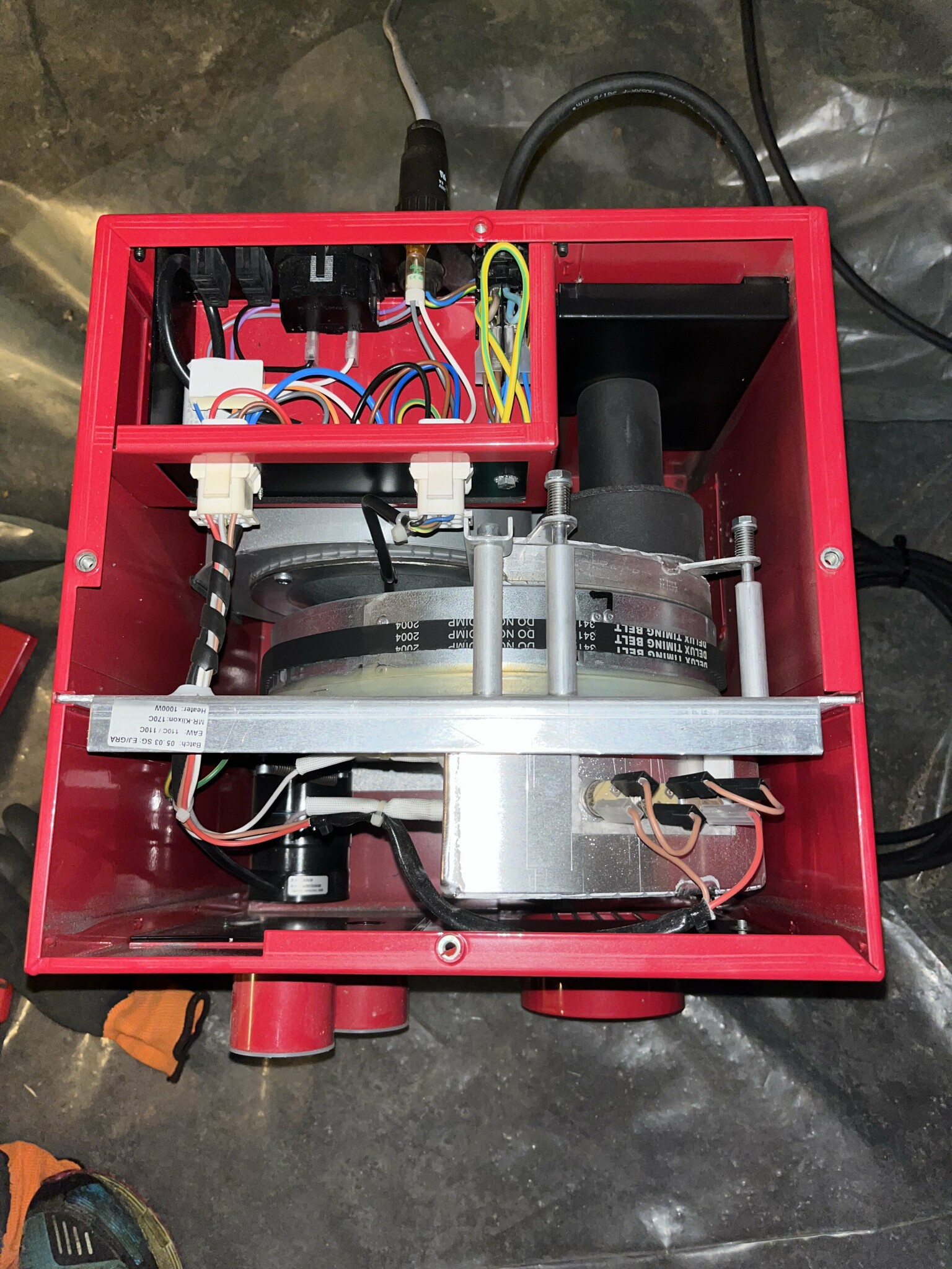 Lampan för "fuktighet för hög" har lyst för länge nu även om fläkten varit igång, så kopplade loss slangar och öppnade upp.