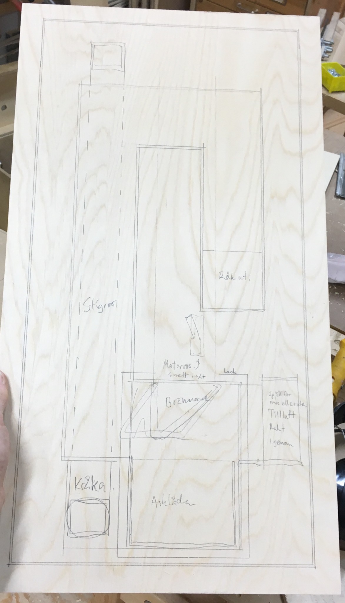 Hålet för brännare och asklåda rektangulärt ända in. Tät lucka framför. Du tänder genom luckan. Kan kanske ha en siktruta i luckan.
