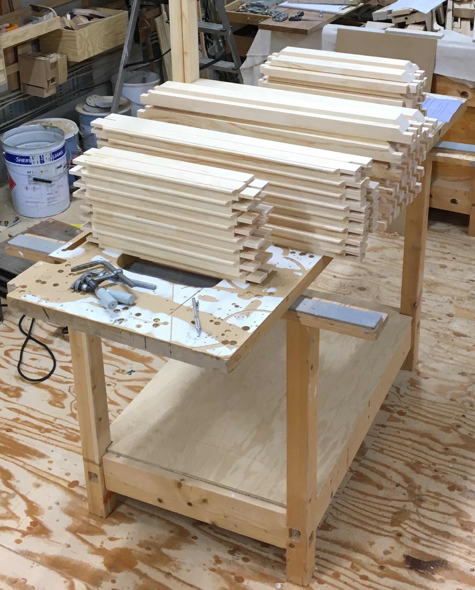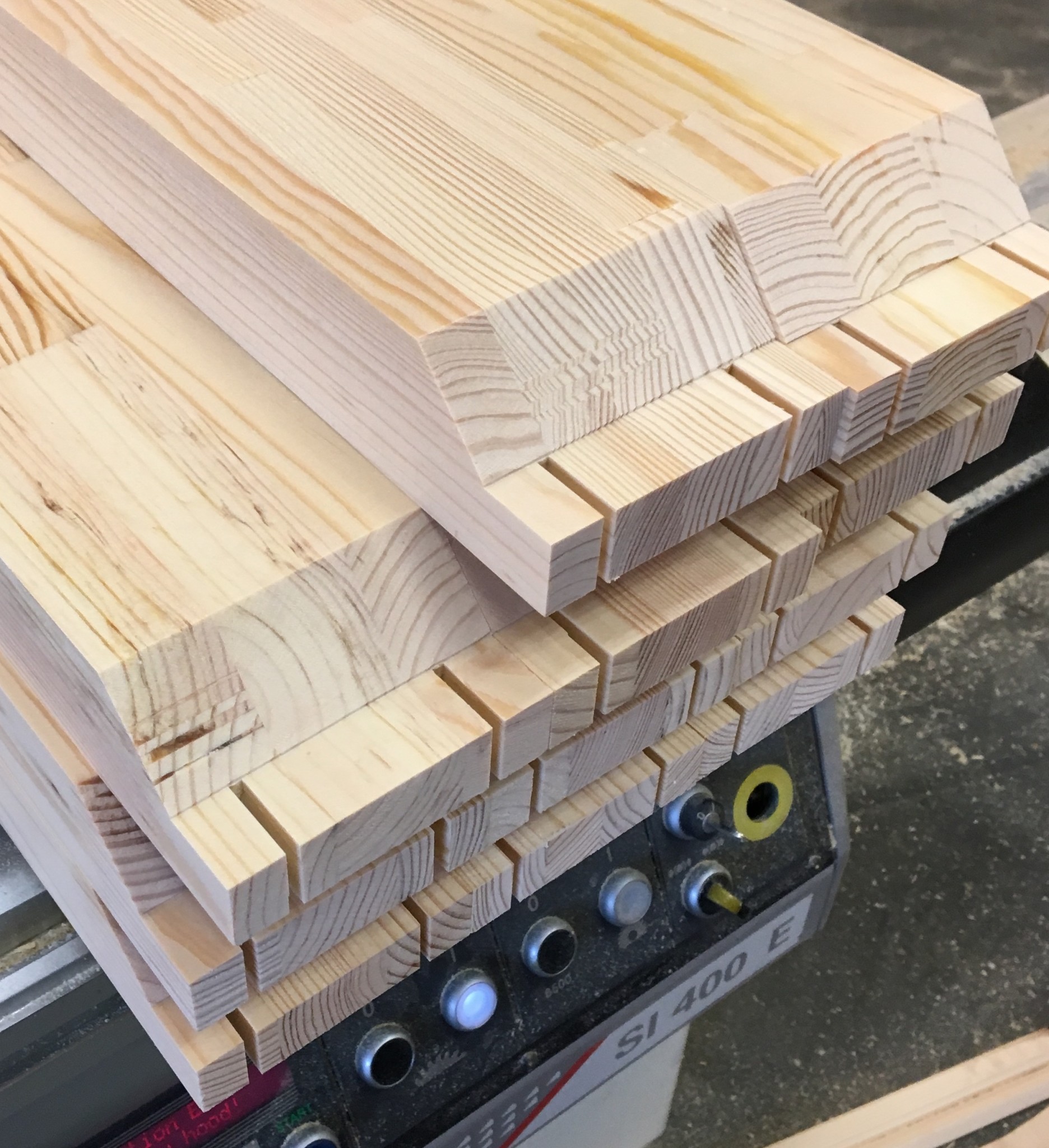 Först grovsåga och hyvla allt. Avsluta med att justera alla bitar till rätt längd.
