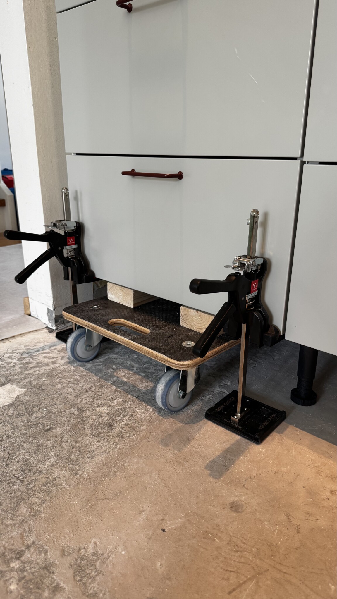 Jag har sneglat på Viking Arms länge men tvekat pga priset. Idag skulle tunga, färdigmonterade bänkskåp på plats och kollegan var sjuk, så bättre köpläge var svårt att få. Sjukt bra pryl! Med dem och en rullvagn med fastskruvade reglar på gick det som en dans att snurra runt och justera in allt utan att bryta sig själv eller skåpen.