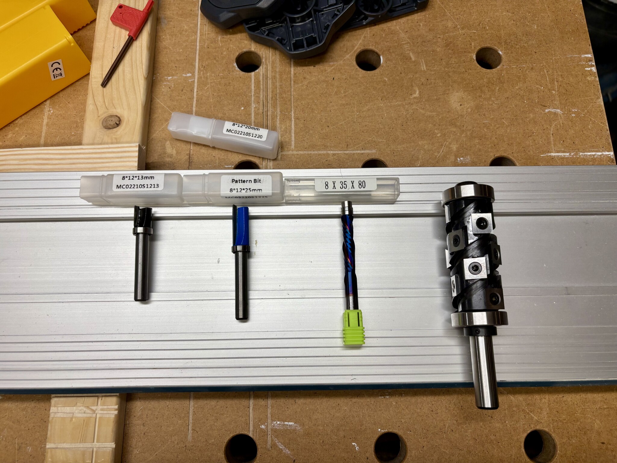Investerat i några mallfräsar inför kommande projekt. 8*12*20 kom till användning för att försänka fräsplattan och fungerade fint trots väldigt lågt pris på Amazon för ett trepack. Räknat per kg är ändå den högra fräsen billigare.