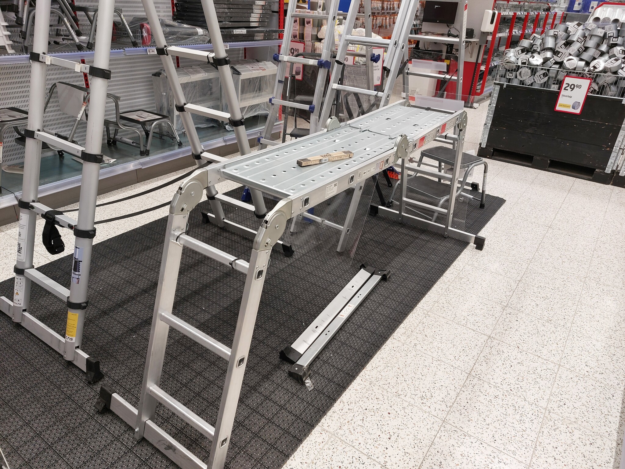 Hittade en okej 2,5 meters aluminiumstege i skrothögen och en multistege, men kände att låsfunktionen var bortrostad och tveksam. Sökte på nätet och hittade att Jula kör kampanj på 799 kr inklusive aluminum-plattformen.
