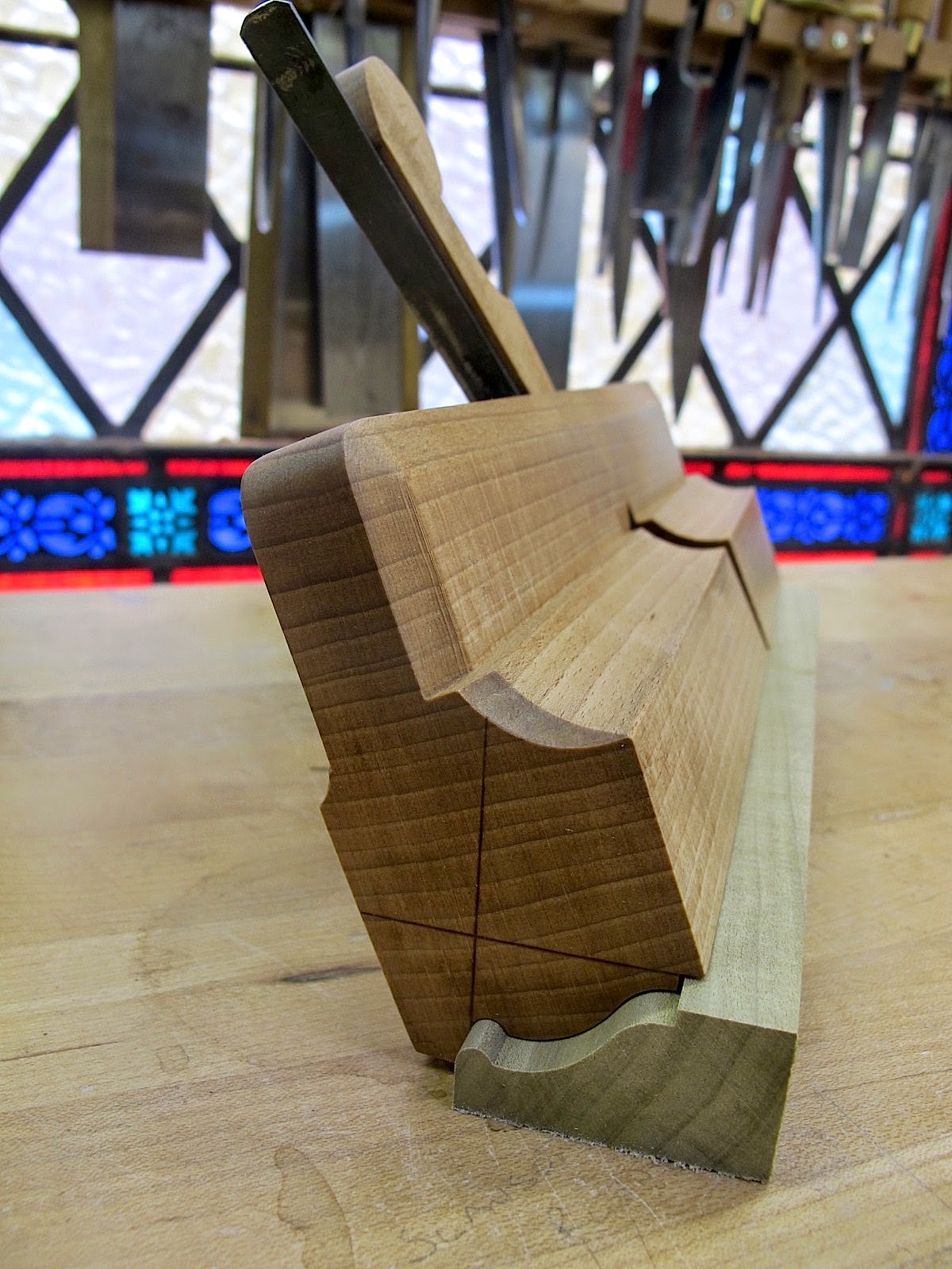 Många profilhyvlar från de anglosaxiska länderna är snedställda som den hyveln, för att få hyveln att stanna konsekvent på kanten. Det finns då som regel linjer på änden av hyveln som visar hur den ska hållas, se bild nedan. Kan det vara samma tanke bakom denna hyvels design?