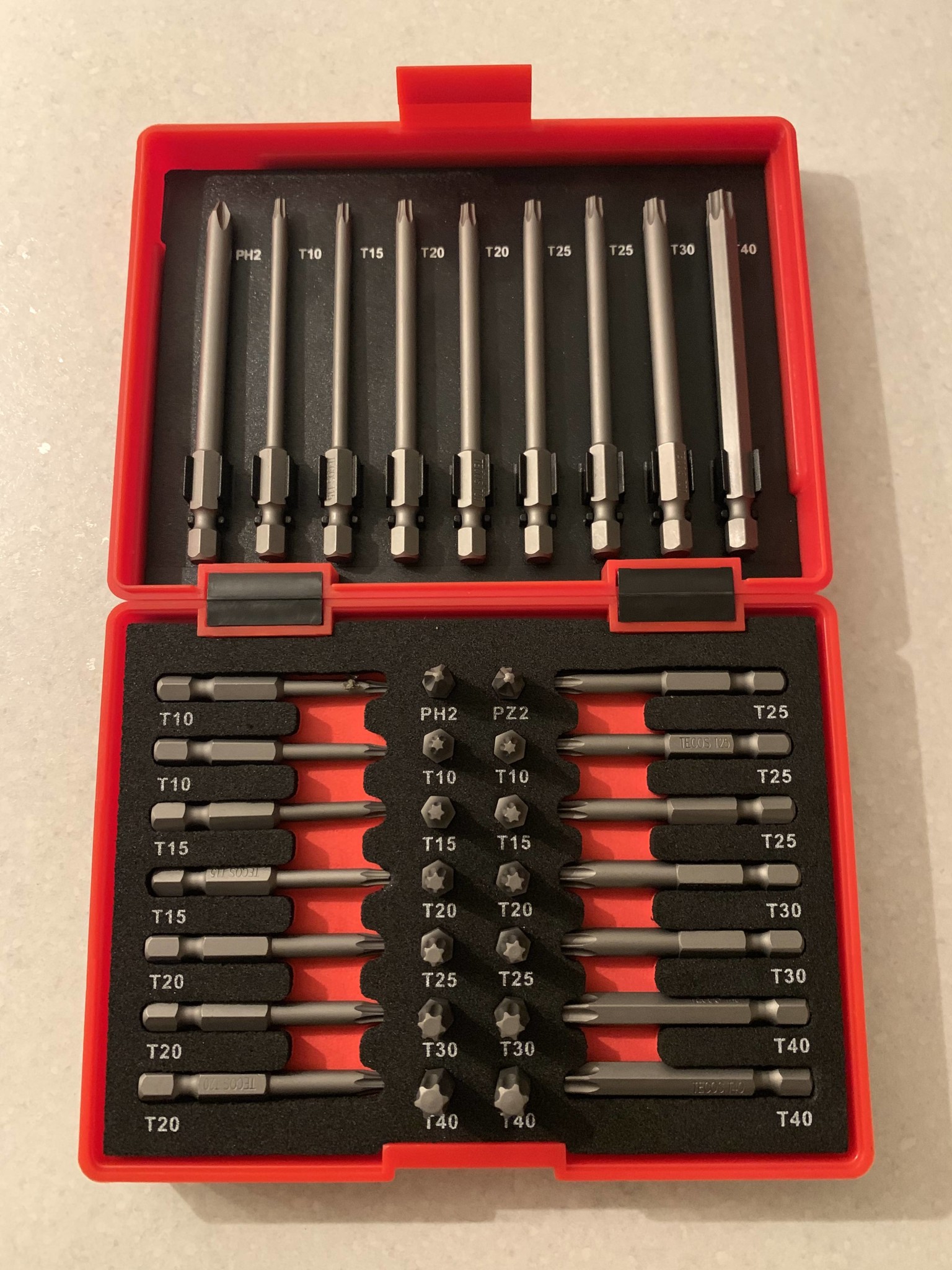 Köpte lite nya bits, då jag inte hade så många långa. Köpte även med lite trallskruv till vårens projekt. Mejslarna fick jag gratis som välkomspresent (och 20% rabatt).