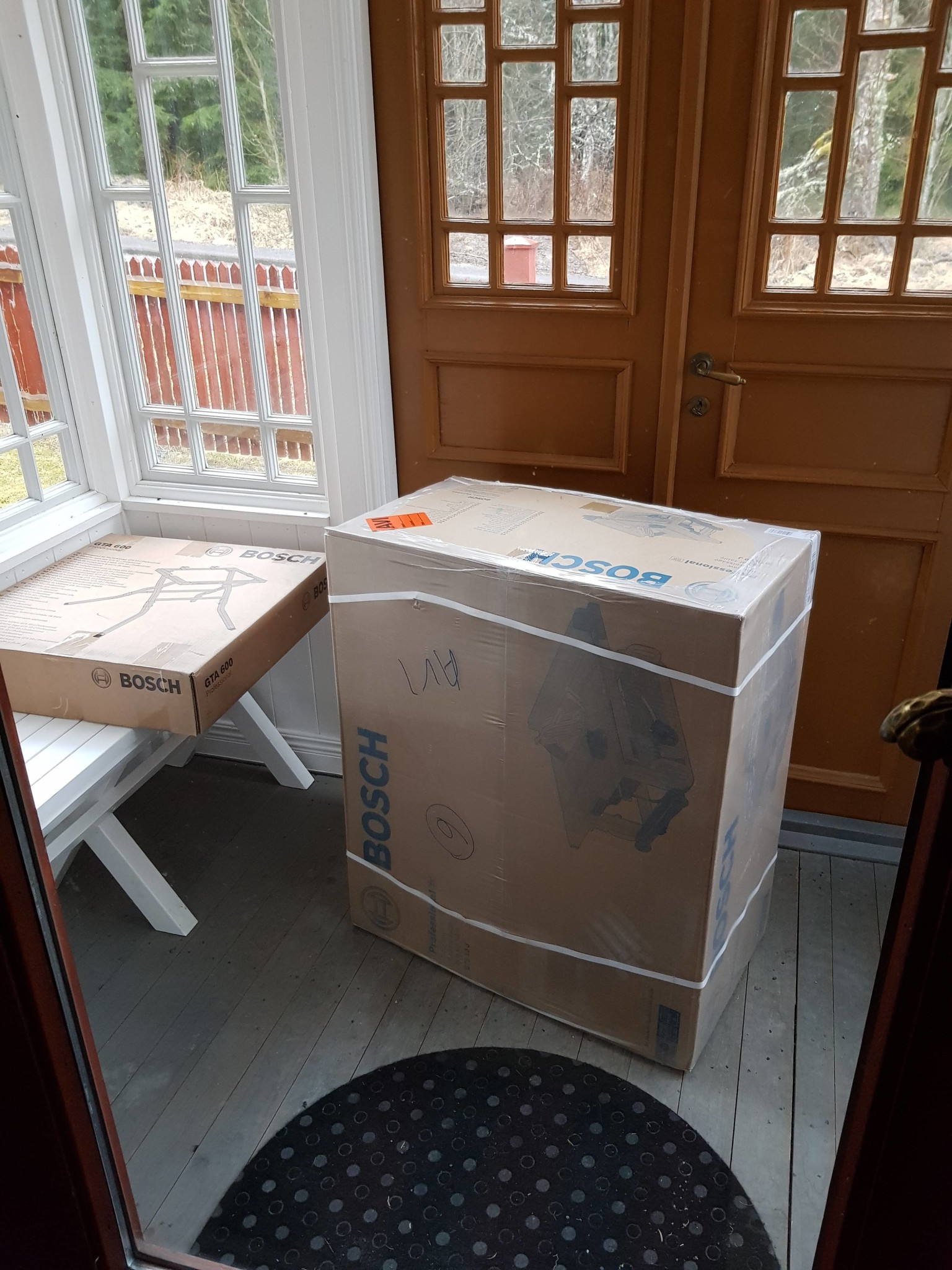 DHL levererade en av byggklossarna till min nya förminskade verkstad. Nu kan jag sälja av min gamla klyvsåg som lätt äter upp 1,5 m2 golvyta.