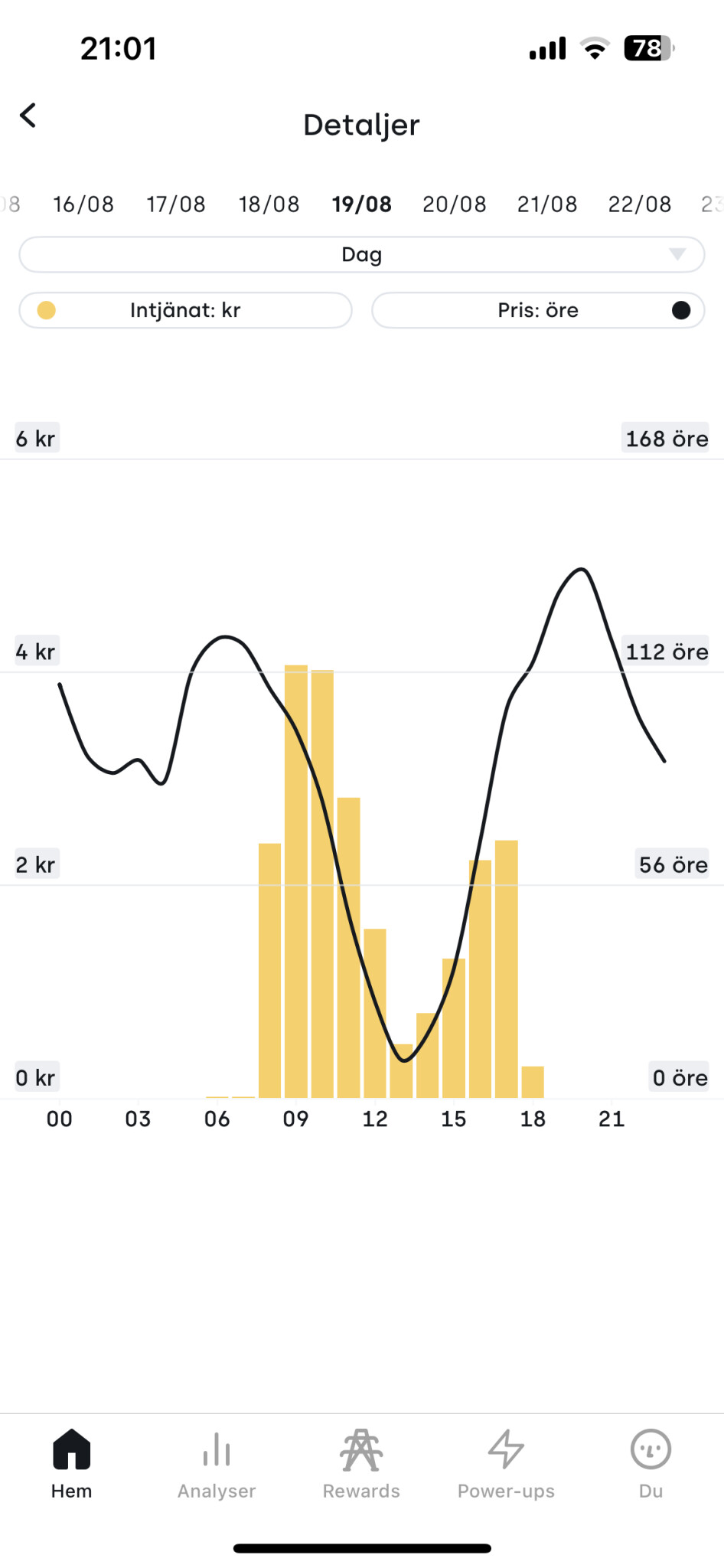 På bifogad bild är de gula staplarna timförsäljning av el, den gula linjen är elpriset. Högre elpris högre intäkt, lågt elpris laddas bil (räcker med att göra det lördag & söndag). Har batteri som laddas och gör att ingen el behöver köpas under de ”mörka” timmarna.