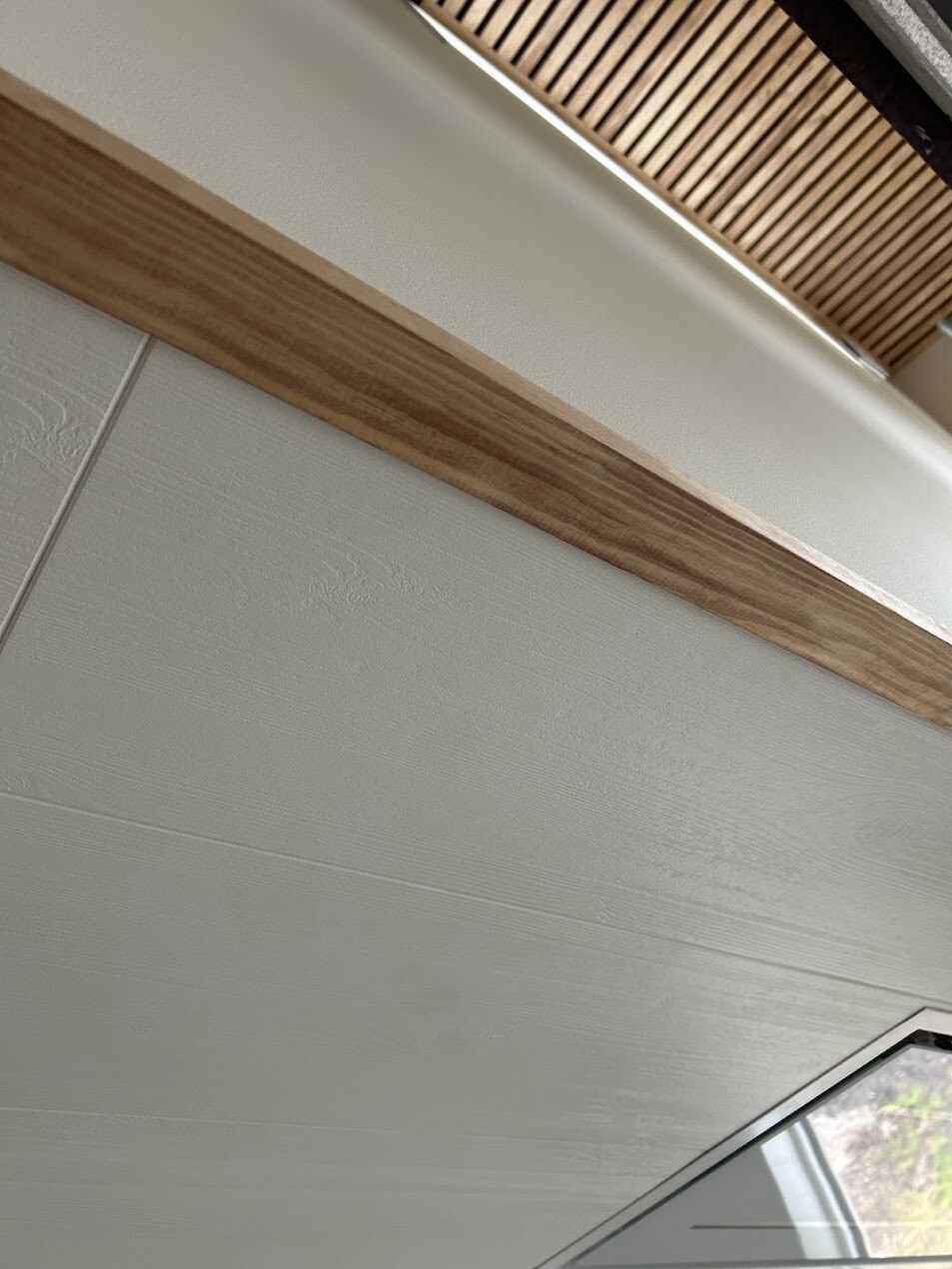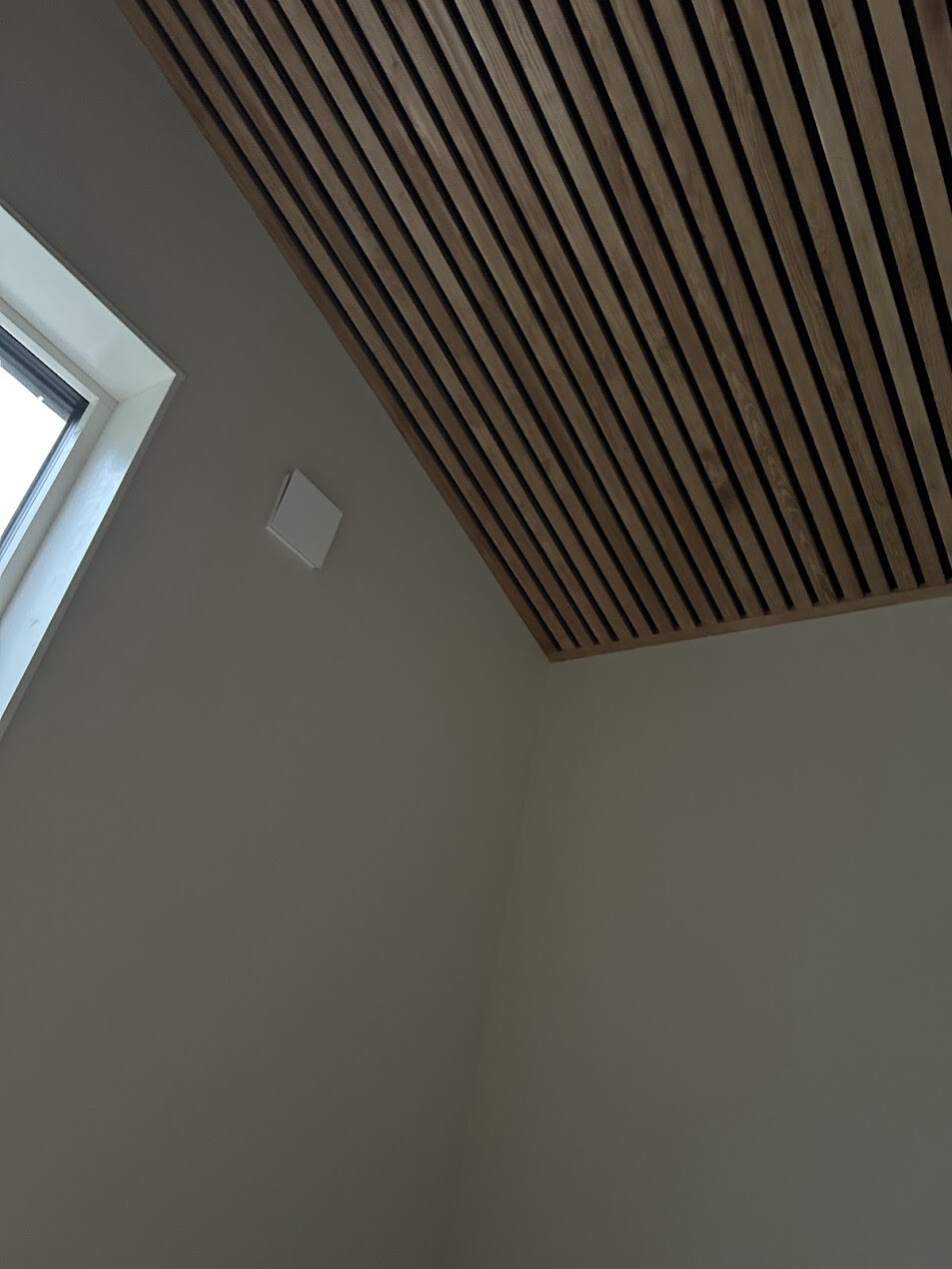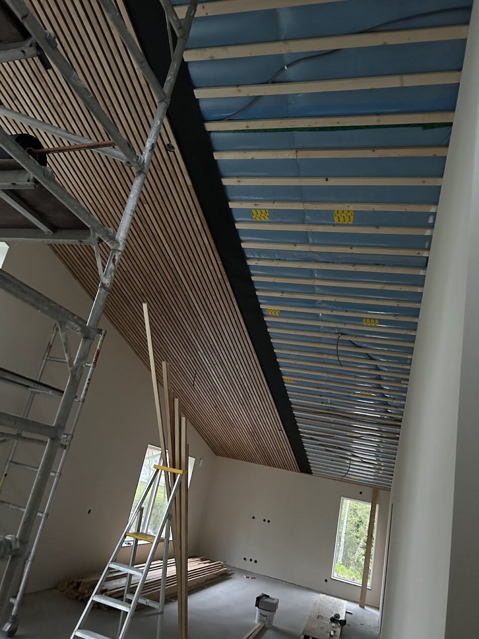 Liknande akustikpaneler, men gör den själv genom att sätta en akustikduk bakom ribbor (21x43 planhyvlad, kvistfri, furu) som jag betsat själv. Gjorde en "ram" runt taket som agerar taklist. Testade även att göra en list i L-profil till anslutningen mellan lågdelens tak och högdelens vägg, genom att klyva en ribba.C Carl Engblom1 skrev: