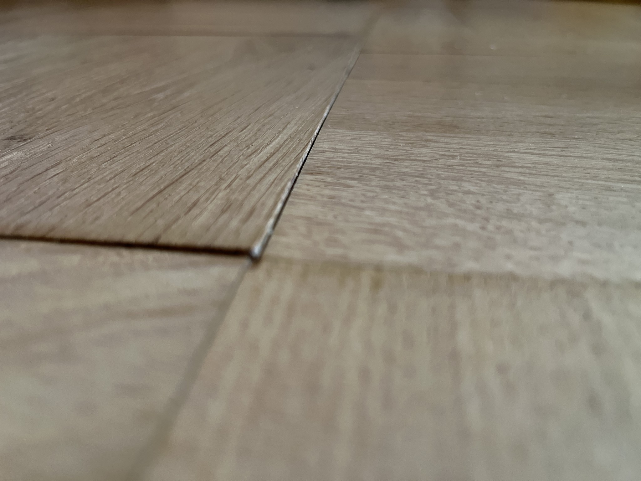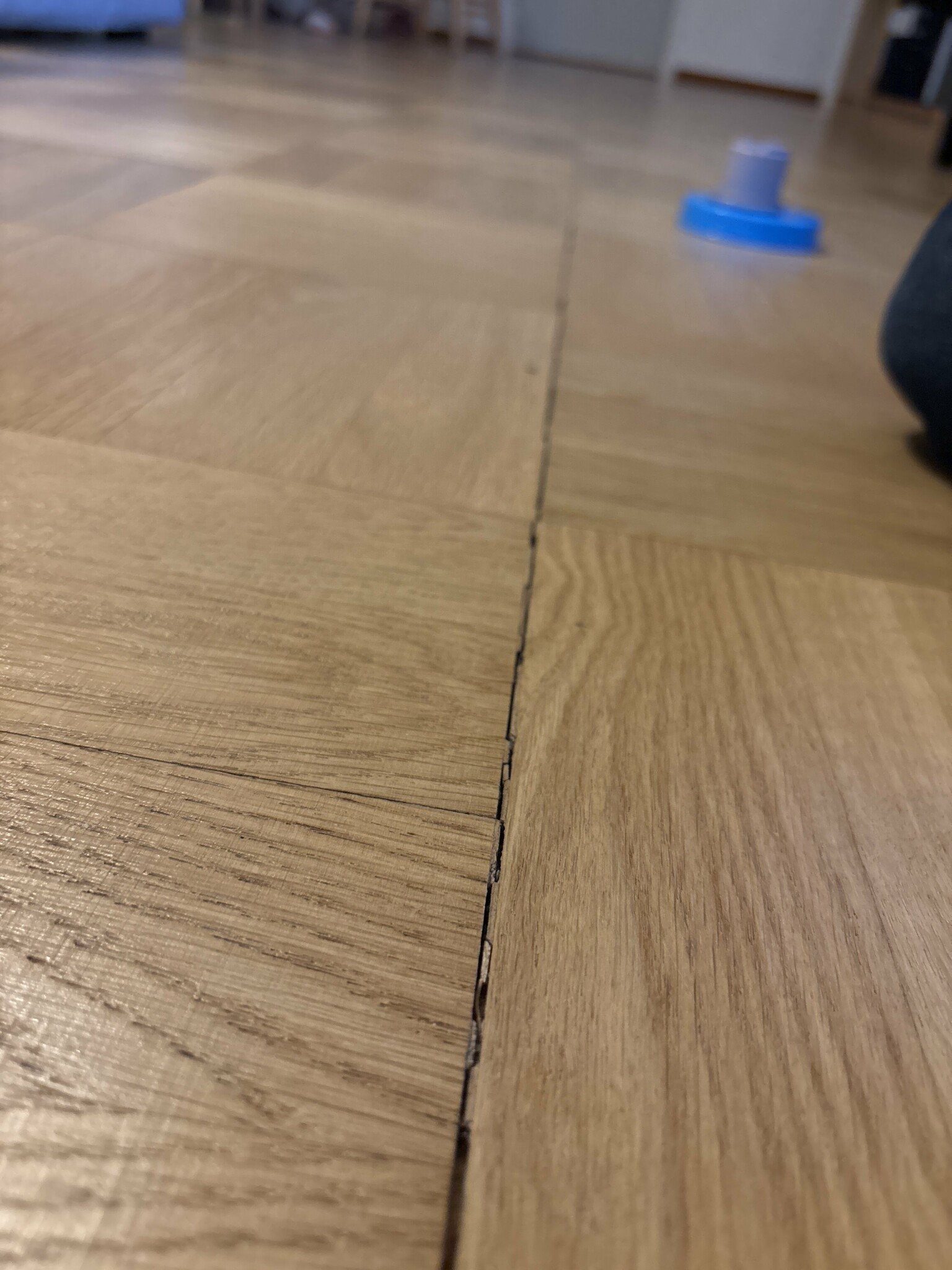 Jag väcker min gamla tråd. Jag tycker det ser ut som att parkettplattorna på vissa ställen hamnat längre ifrån varandra. På en del platser, men inte alla, verkar det sitta någon typ av fog som lossnat och inte ser bra ut. Se bild!