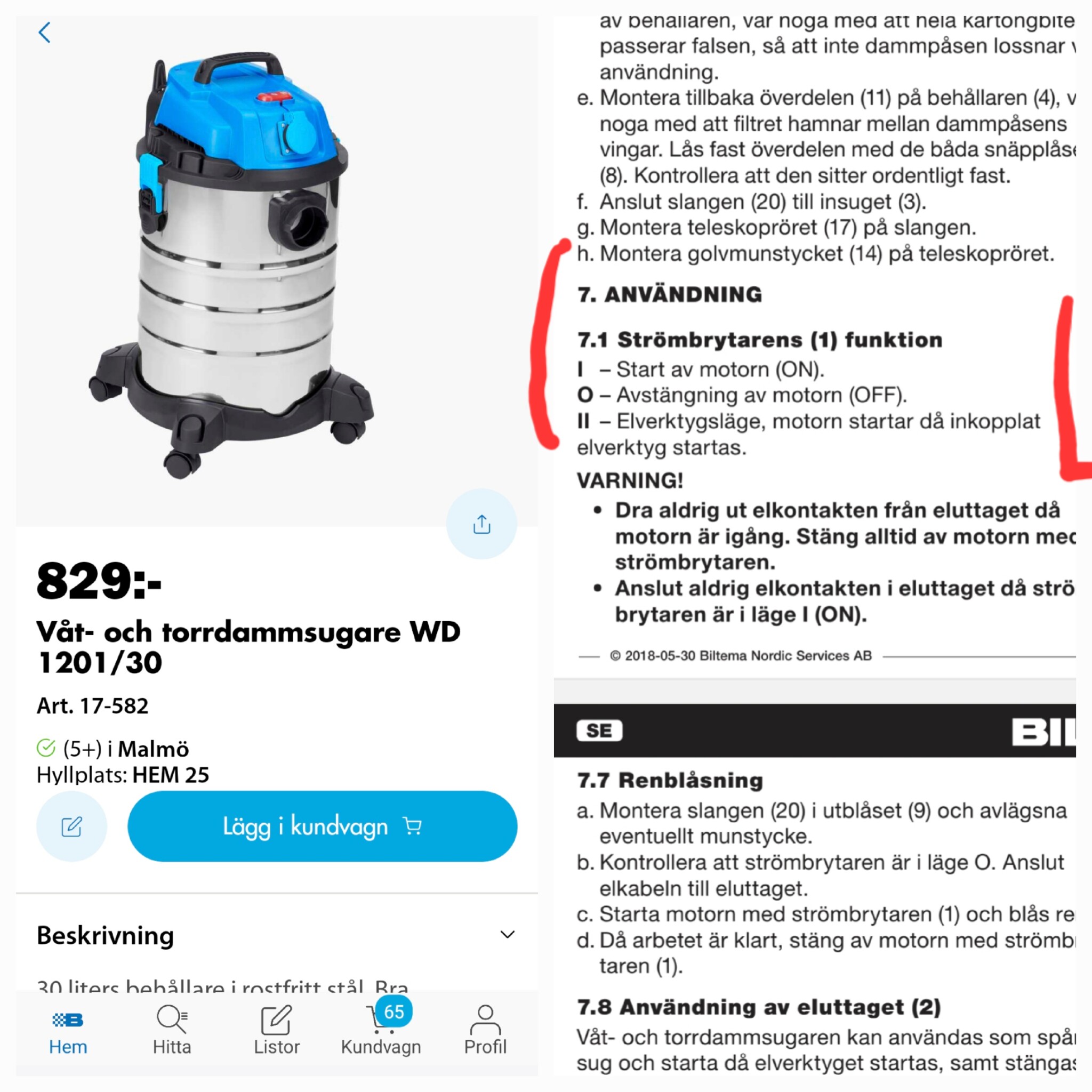 Jag har också denna. Överlag väldigt nöjd med den. Kan ibland tycka att slangen har lite för liten diameter, så lite större träflisor och isolering fastnar gärna. Start/stopp-funktionen fungerar och suger 3 sekunder efter, vilket är väldigt bra för att ta sista resterna efter att man sågat färdigt.Z Zachtionman skrev:
