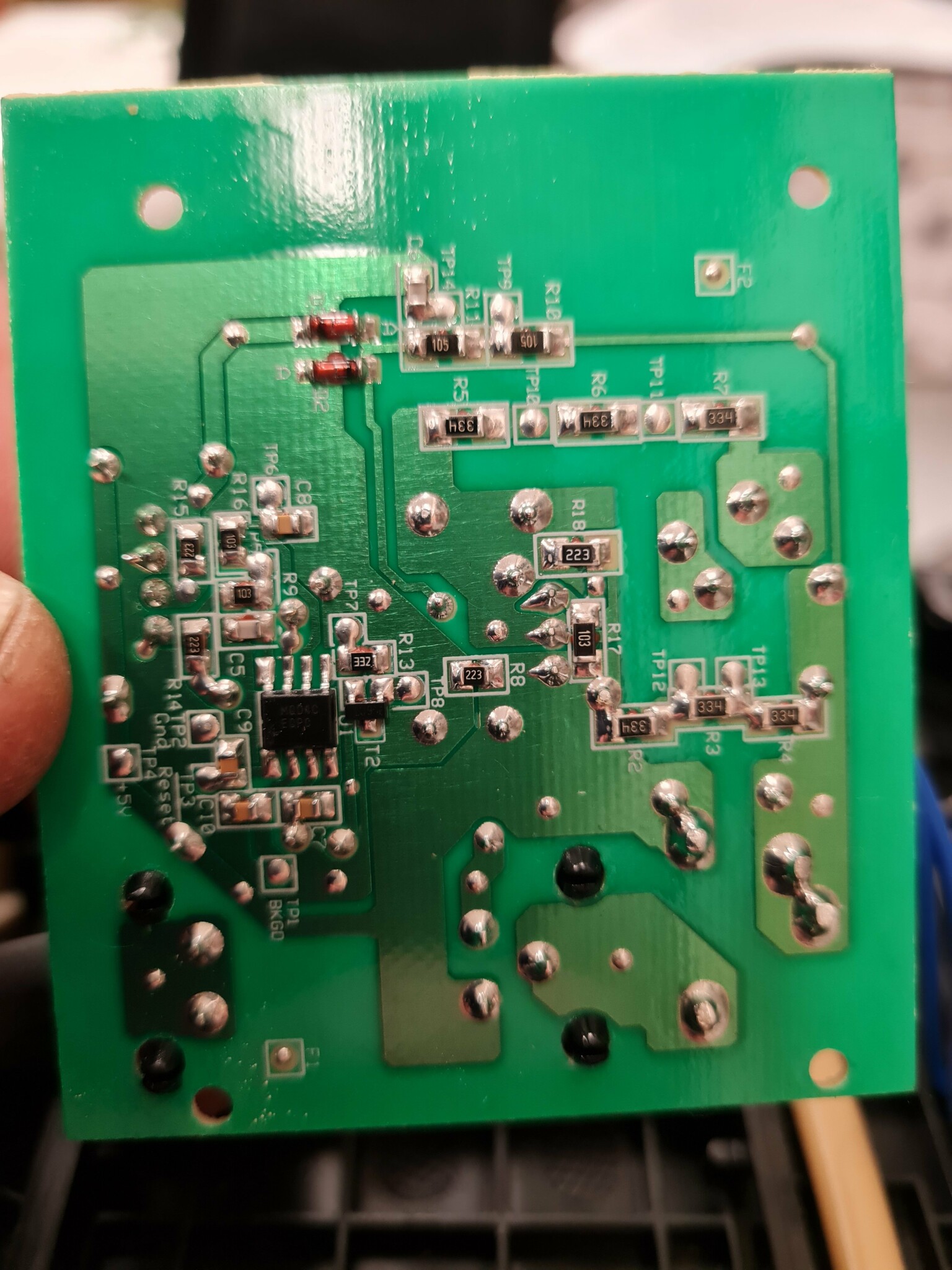 Jag skulle börja med att kontrollera kraftkomponenterna man ser på ena sidan kretskortet, den gula X2-kondensatorn till höger, dioden, zenerdioden, de två effektresistorerna i överkant. Elektrolytkondensatorer brukar visserligen ge sig men denna på bild i #14 tror jag är okritisk för funktionen.